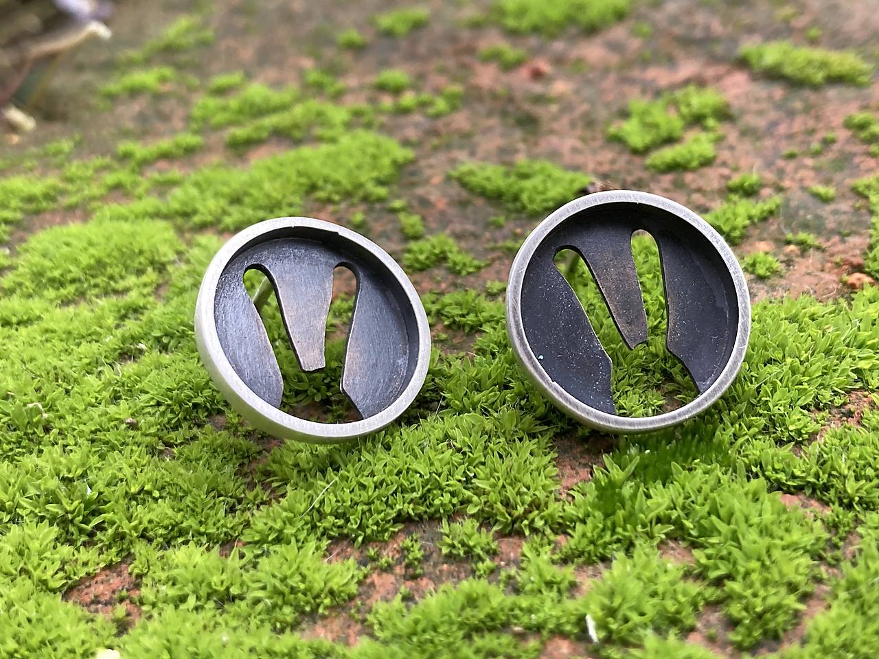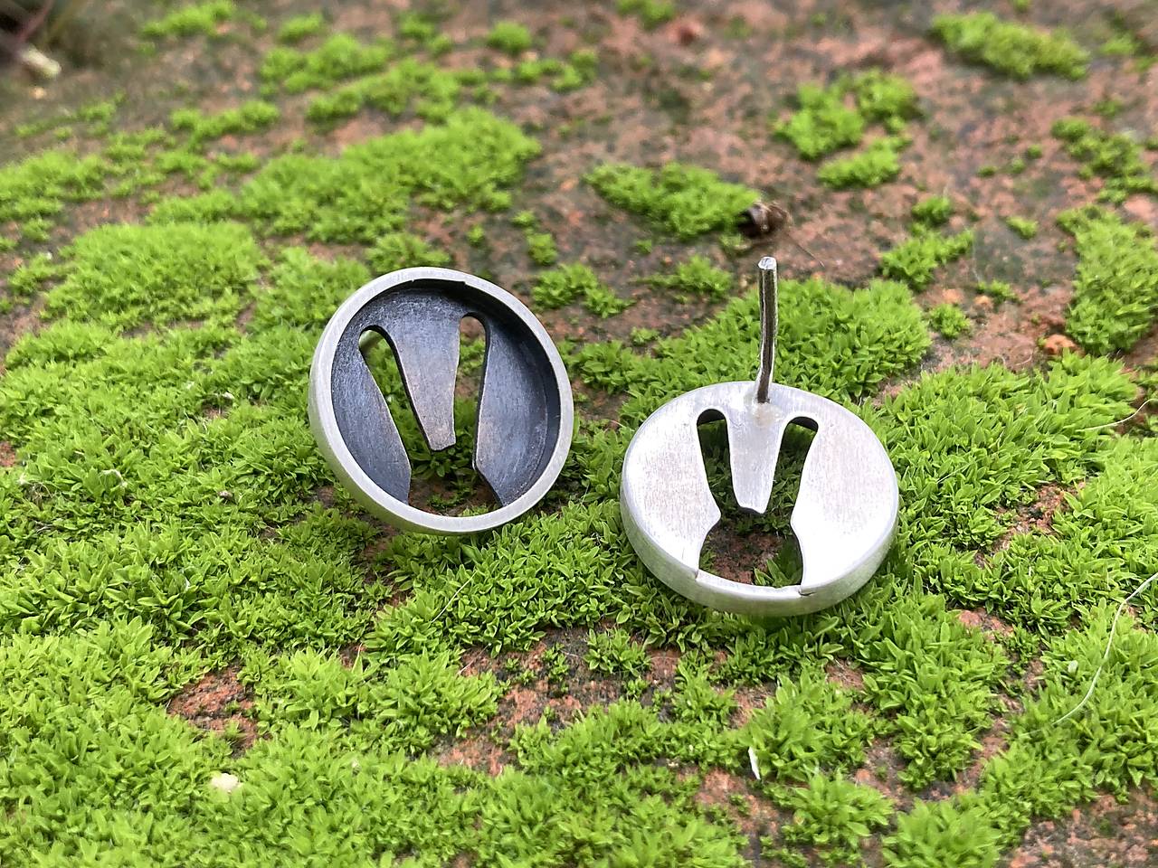 Náušnice Zajačiky negatív - z kolekcie Zajkov príbeh sú vyrezané ručne lupienkovou pílkou zo strieborného plechu. Sú to tzv. pichačky, nevisia. Kolíček do ucha je naspájkovaný vo vrchnej časti krúžku, takže po vložení do ušnej dierky, kolieska akoby trochu pretrčajú cez ušný lalôčik- záleží ako vysoko je dierka. Vnútorná plocha náušnice v ktorej je vyrezaný "tieň" zajka je zapatinovaná na čierno, ošetrená reštaurátorským lakom. Náušnica sa v uchu zaisťuje strieborným motýlikom