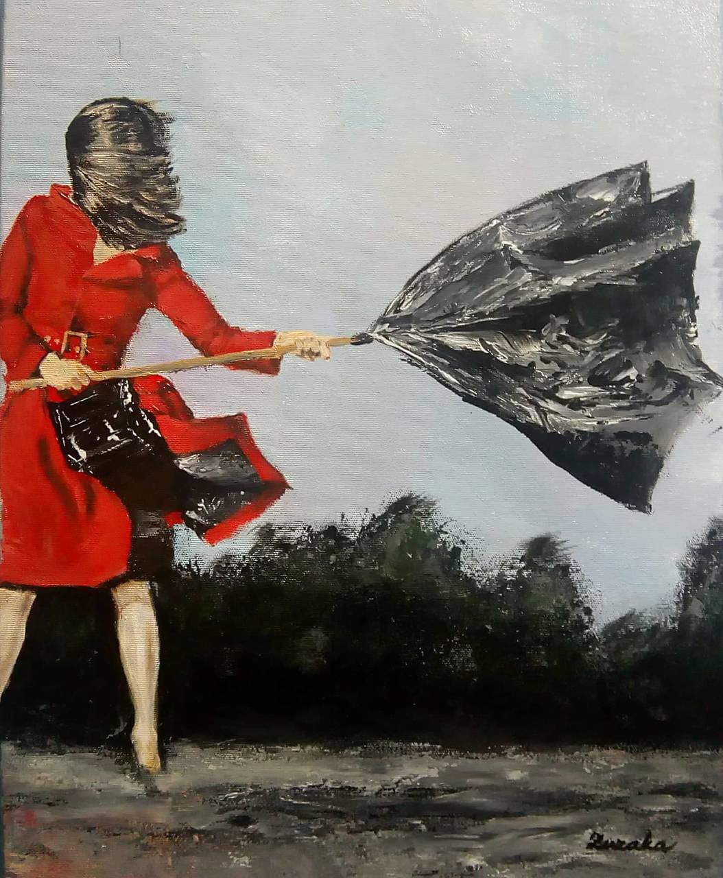 Ak hľadáte dar, ktorý dokáže preniesť túto neuveriteľnú silu a odhodlanie, môj obraz s názvom ,,S nervami v koncoch" je tou správnou voľbou. Tento obraz zachytáva silu ženy, ktorá sa neohrozene bráni náporom vetra a dažďa, držiac dáždnik pevne vo svojich rukách. Je to príbeh o vytrvalosti, odvahe a nezlomnom duchu.