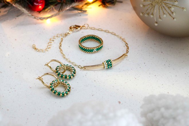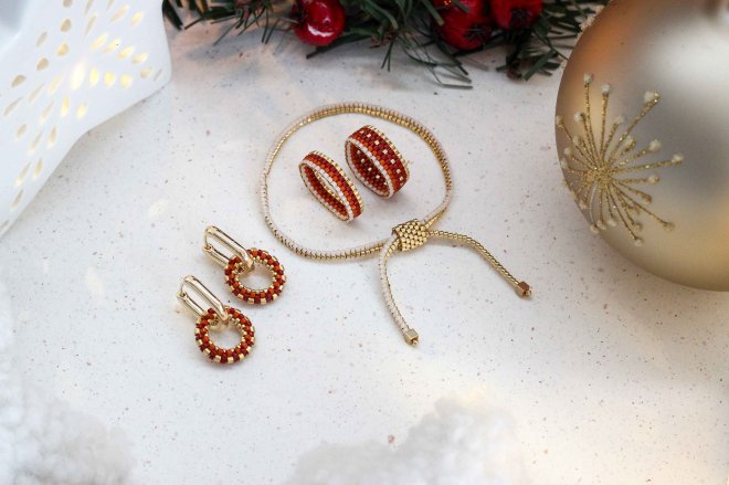 Set jemných náušníc, prsteňov a náramku s červenými detailmi. Ich teplé tóny pripomenú vianočnú atmosféru a zahrejú pri srdci.