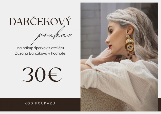 Neviete sa rozhodnúť, ktorý šperk by bol ten pravý darček? Alebo chcete nechať výber na obdarovanú osobu? V tom prípade sú darčekové poukazy ideálnym riešením! Sú dostupné v štyroch cenových kategóriách, aby si každý našiel vhodnú alternatívu, no pokiaľ by ste preferovali inú sumu, neváhajte a kontaktujte ma – rada vám vytvorím poukaz presne na želanie.