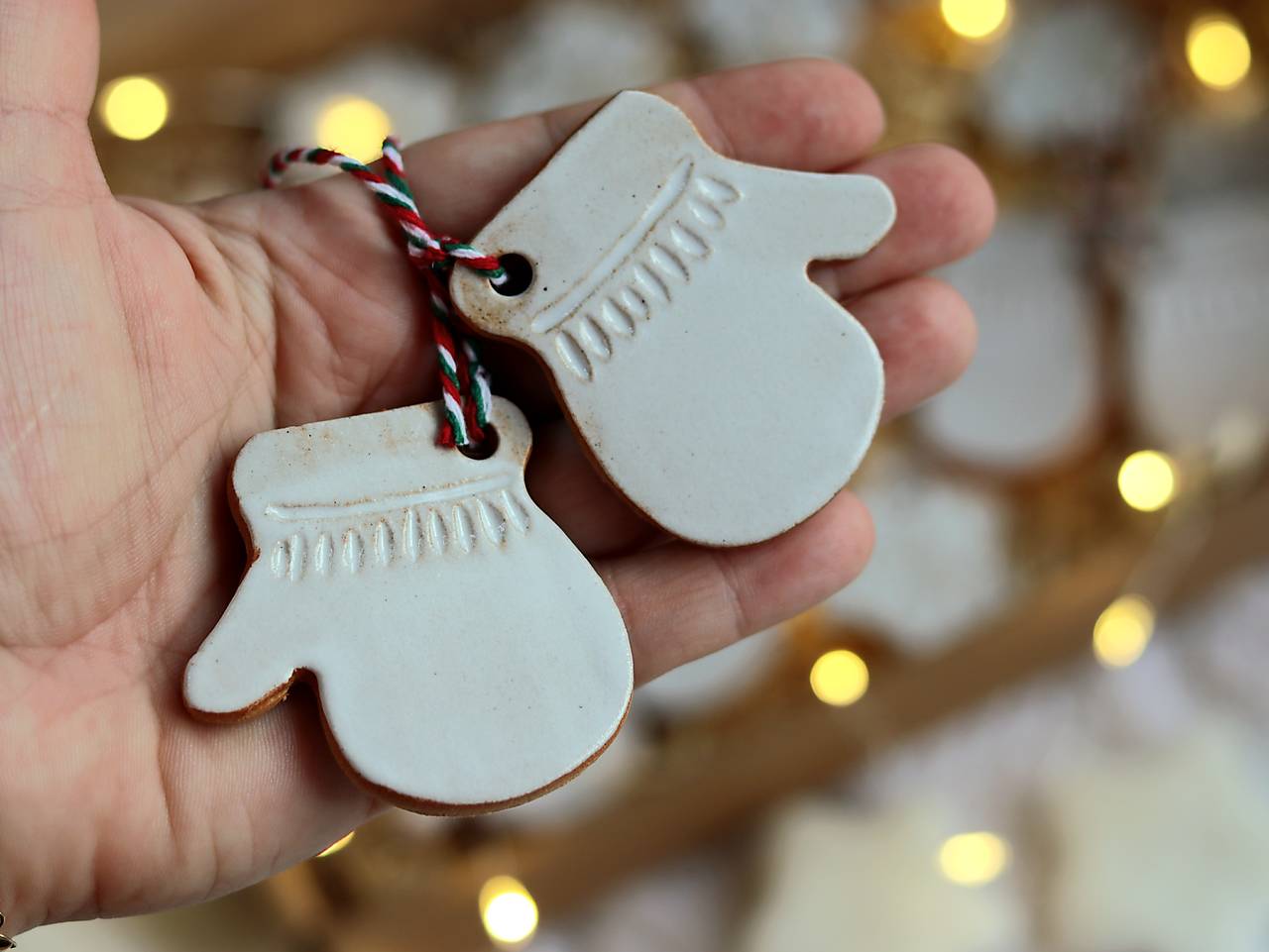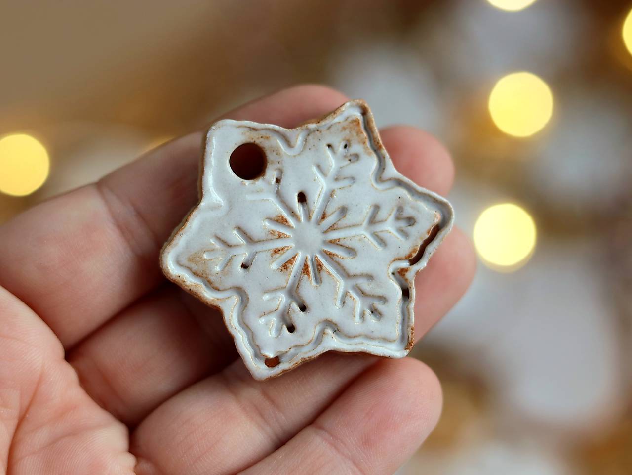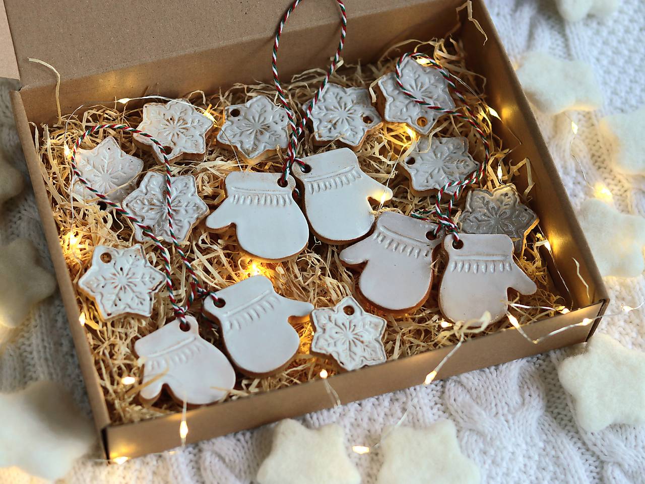 Keramické ozdoby na vianočný stromček v bielej farbe.