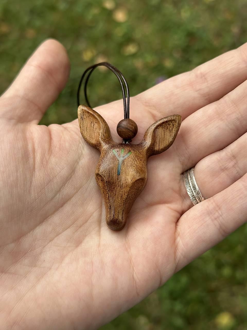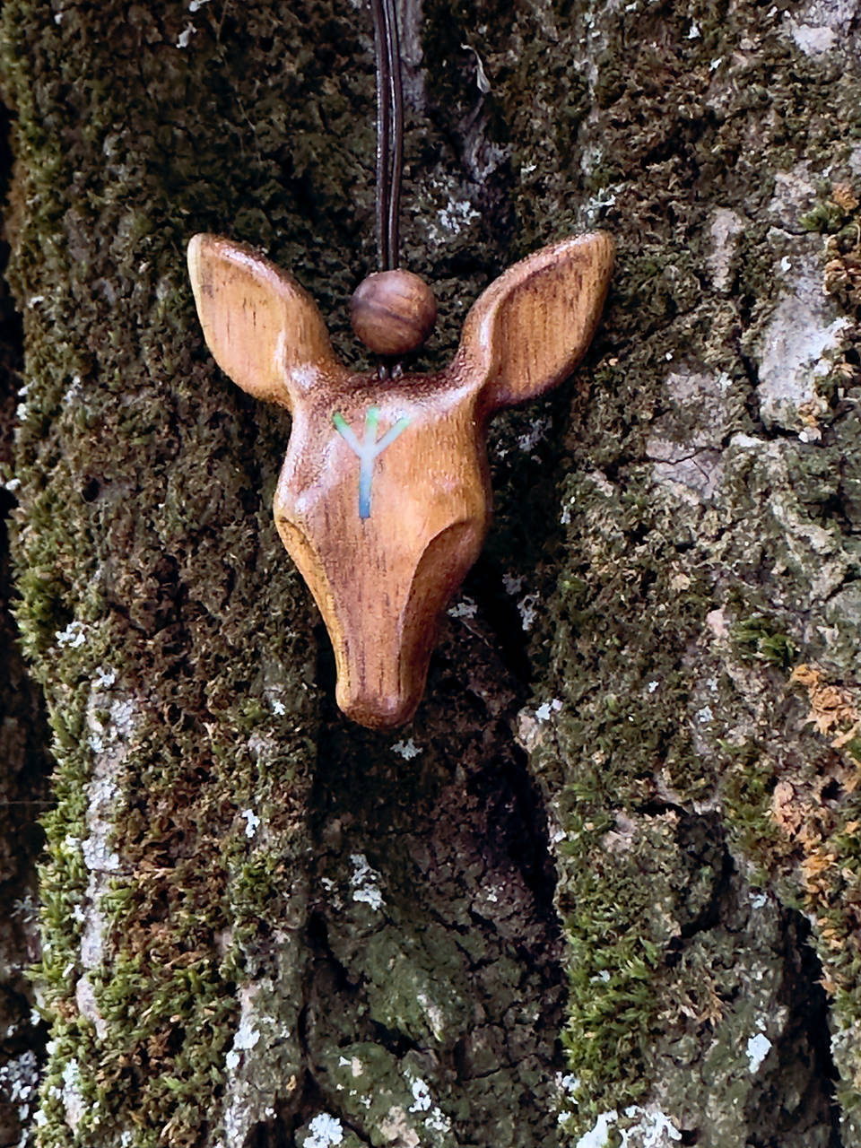 Drevený prívesok z prírodného dreva (akácia, orech) na koženej šnúrke. Prívesok zdobí fosforeskujúca runa ALGIZ, ktorá je znakom ochrany.