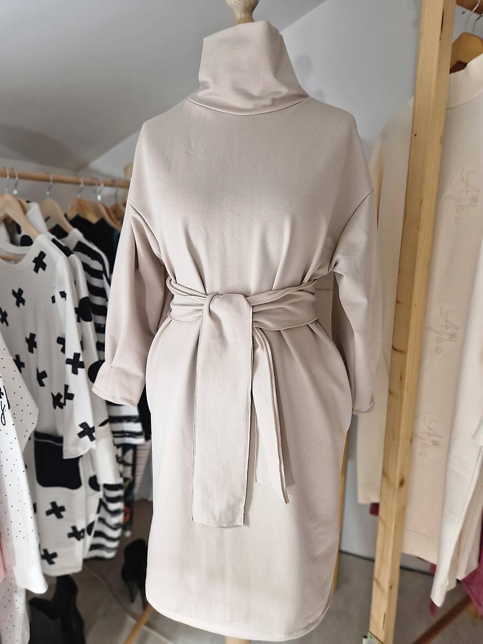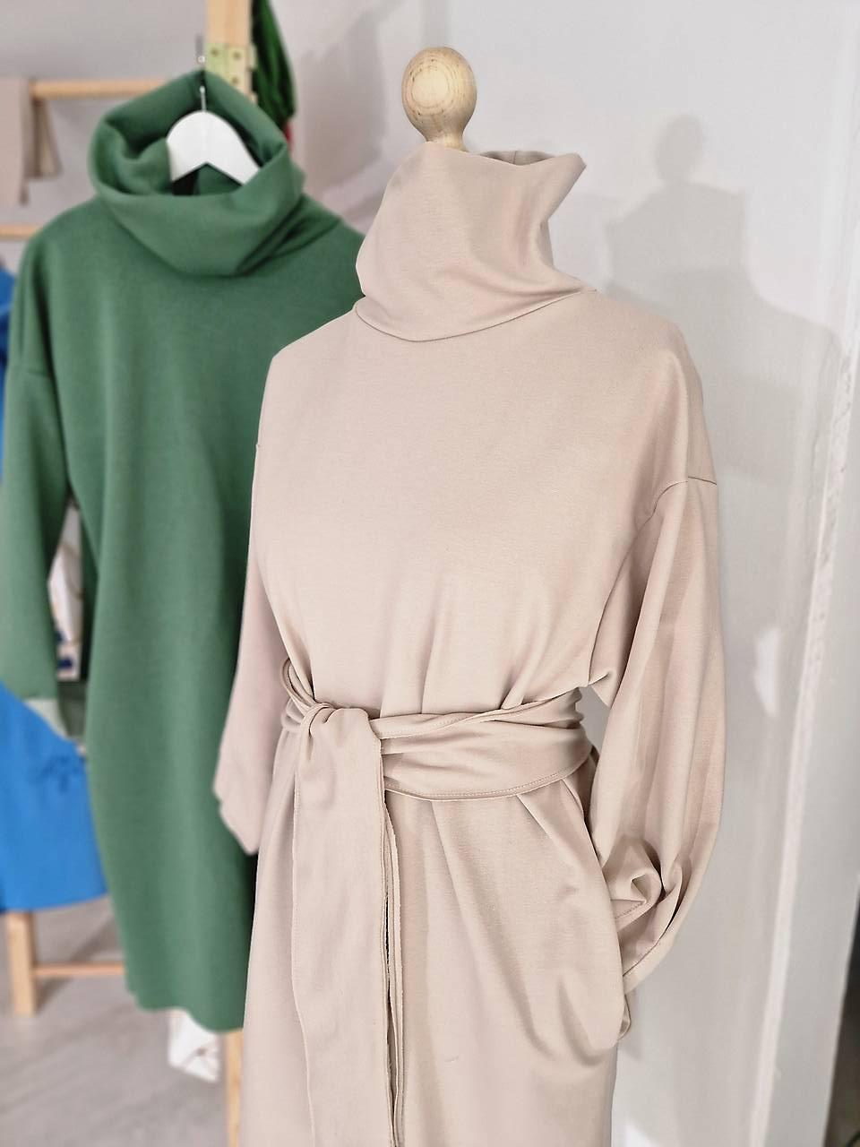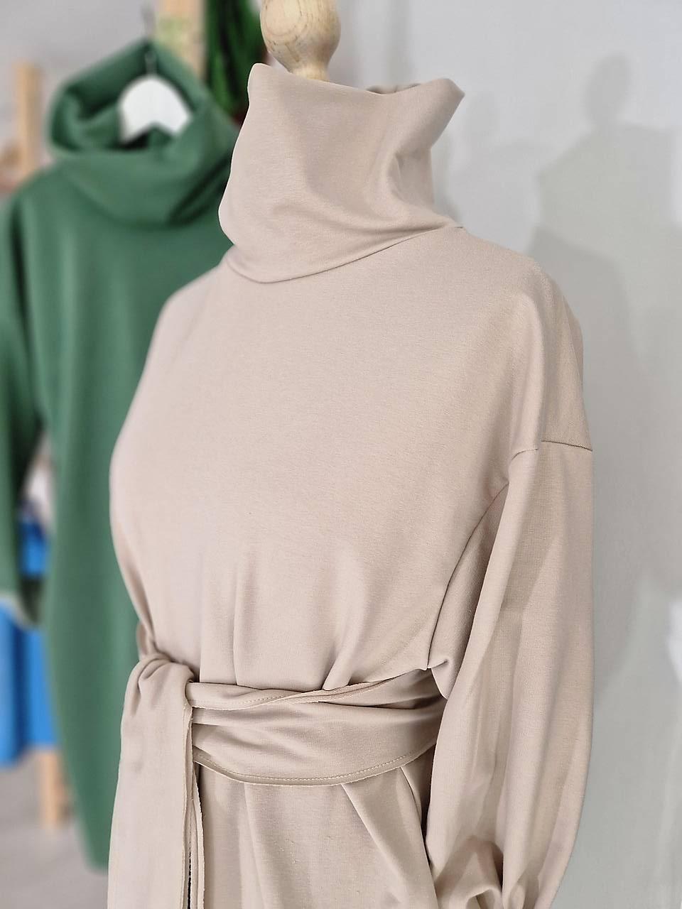 Šaty „ELYSIA“ sú dokonalým spojením pohodlia, štýlu a jedinečnosti. Vyrobené z kvalitnej elastickej teplákoviny, vynikajú jednoduchým rovným strihom, vysokým rolákom a elegantnými balónovými rukávmi. Praktické veľké vrecká a širší opasok dodávajú šatám moderný a funkčný charakter.