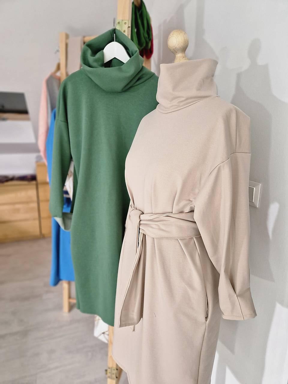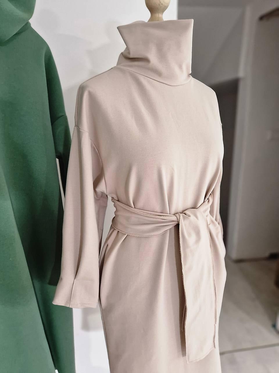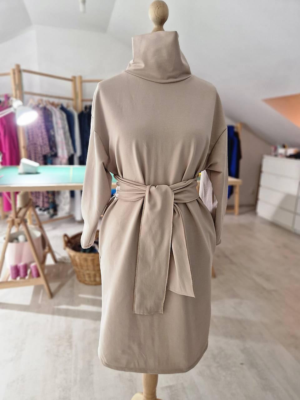 Šaty „ELYSIA“ sú dokonalým spojením pohodlia, štýlu a jedinečnosti. Vyrobené z kvalitnej elastickej teplákoviny, vynikajú jednoduchým rovným strihom, vysokým rolákom a elegantnými balónovými rukávmi. Praktické veľké vrecká a širší opasok dodávajú šatám moderný a funkčný charakter.