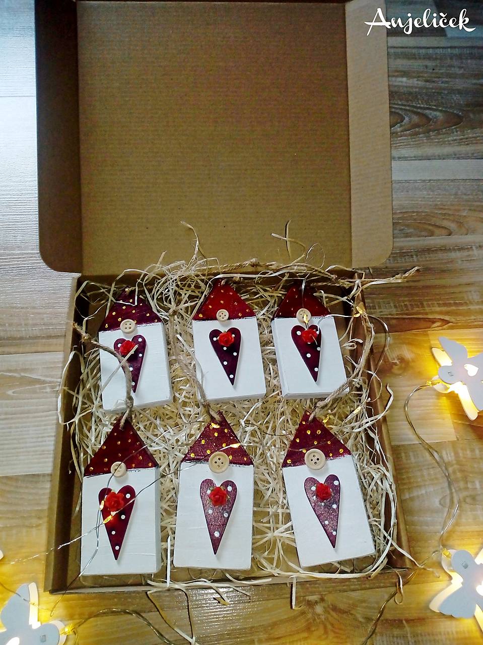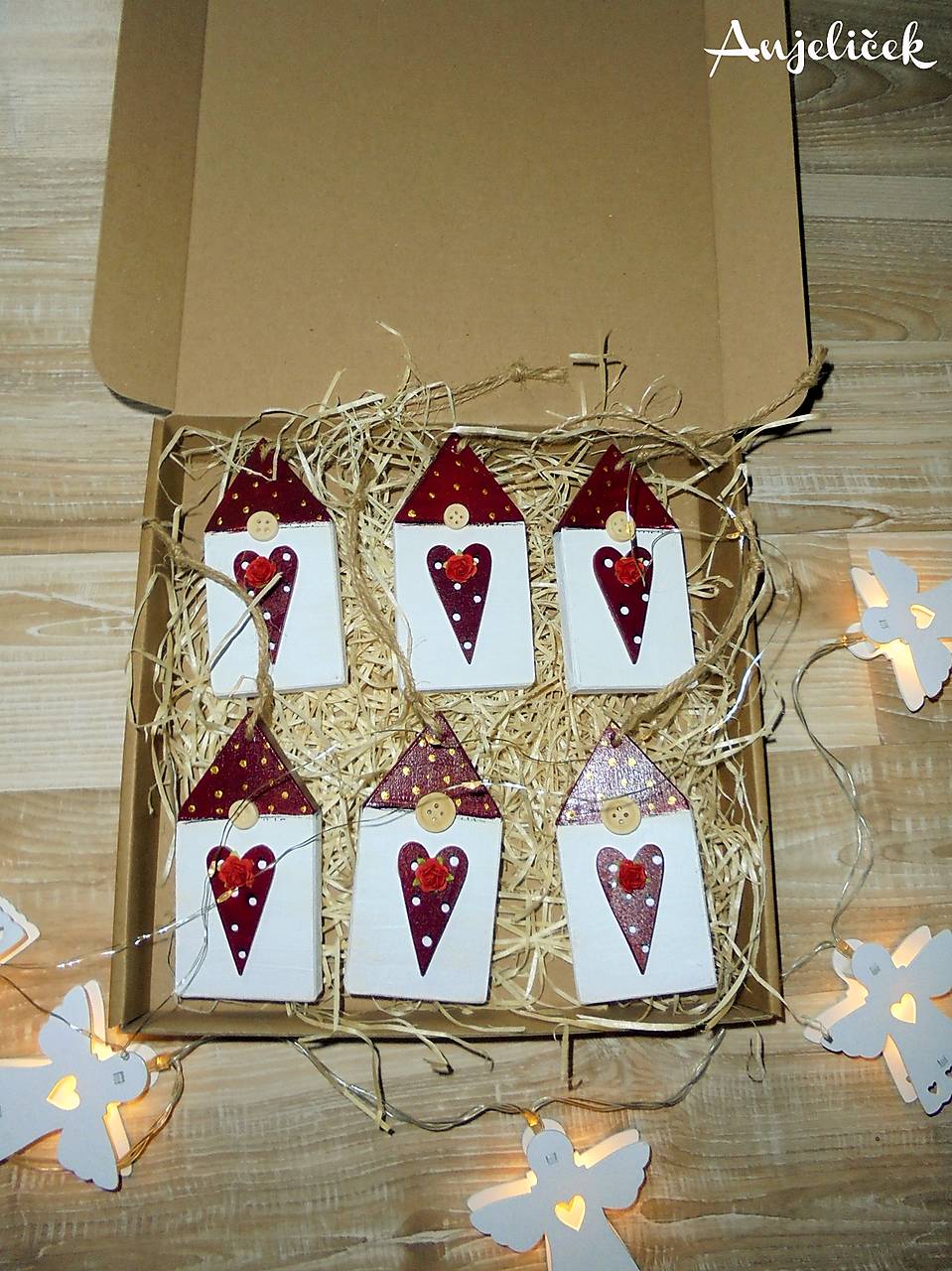 Ručne vyrobené drevené ozdôbky, ktoré krásne spríjemnia Váš Vianočný domov. Ozdôbky dodávame v darčekovom balení, tak ako sú zobrazené. Originálna autorská Vianočná výzdoba z dielne anjeliček.