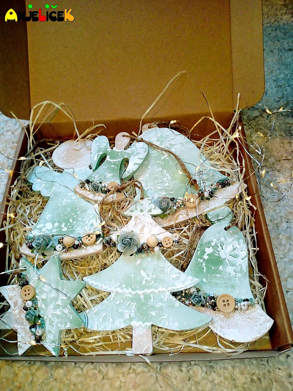 Ručne vyrobené drevené ozdôbky, ktoré krásne spríjemnia Váš Vianočný domov. Ozdôbky dodávame v darčekovom balení, tak ako sú zobrazené. V krabičke sú 3 veľké a 3 menšie ozdôbky. Dajú sa doladiť aj na želanie. Originálna autorská Vianočná výzdoba z dielne anjeliček.