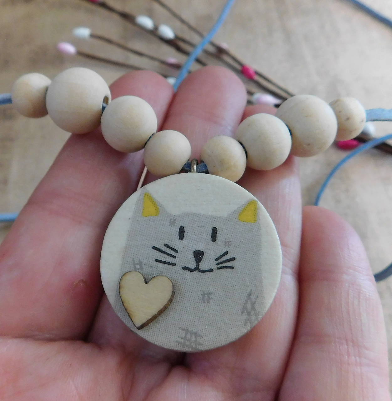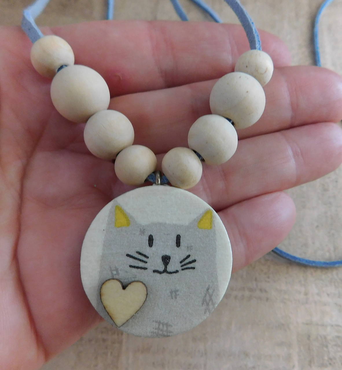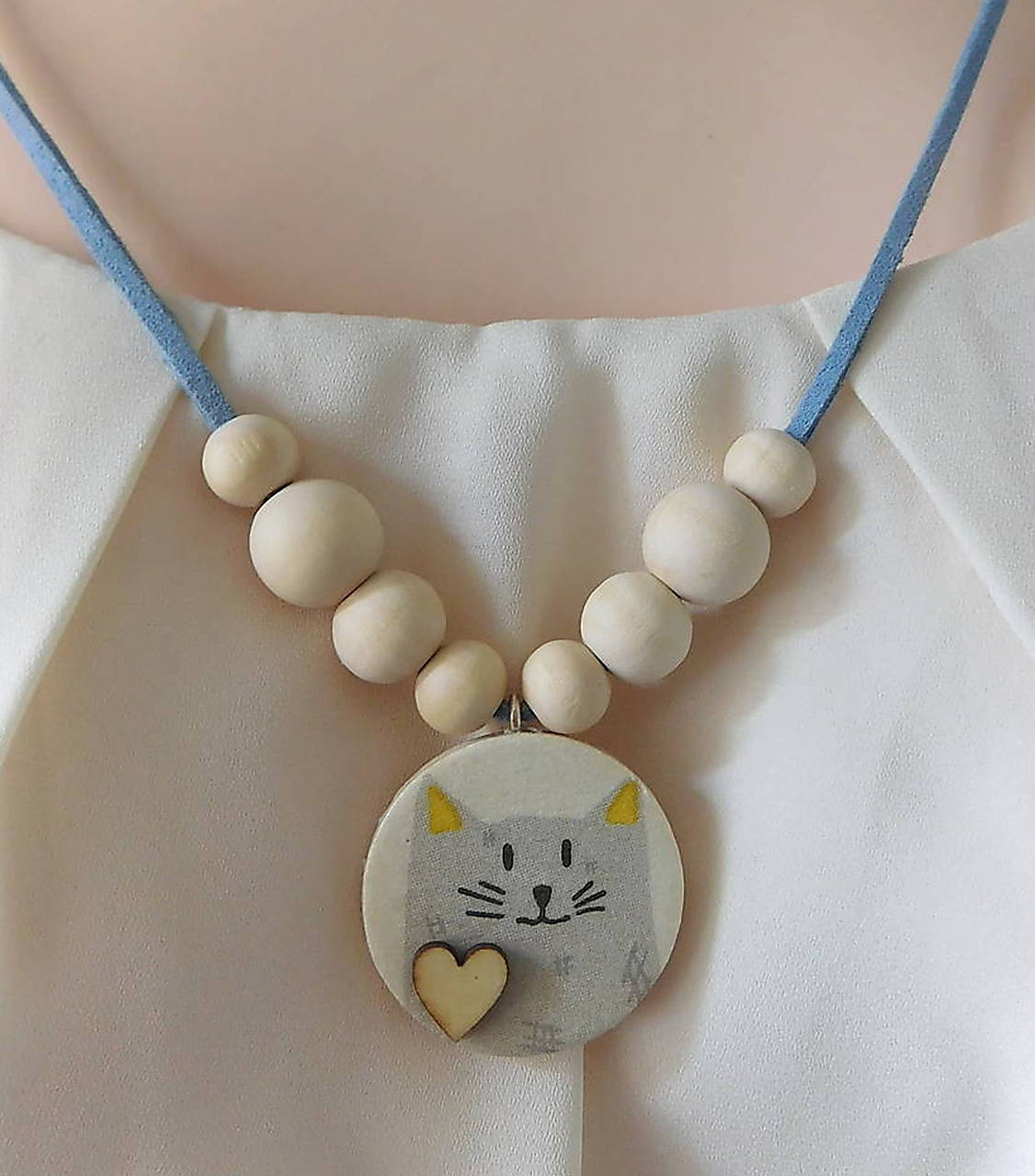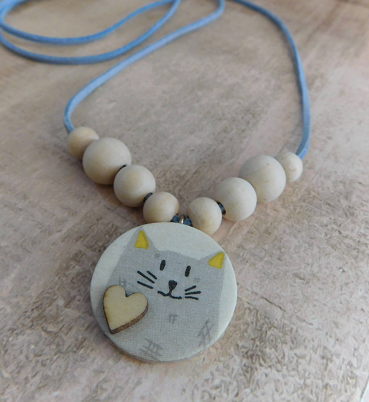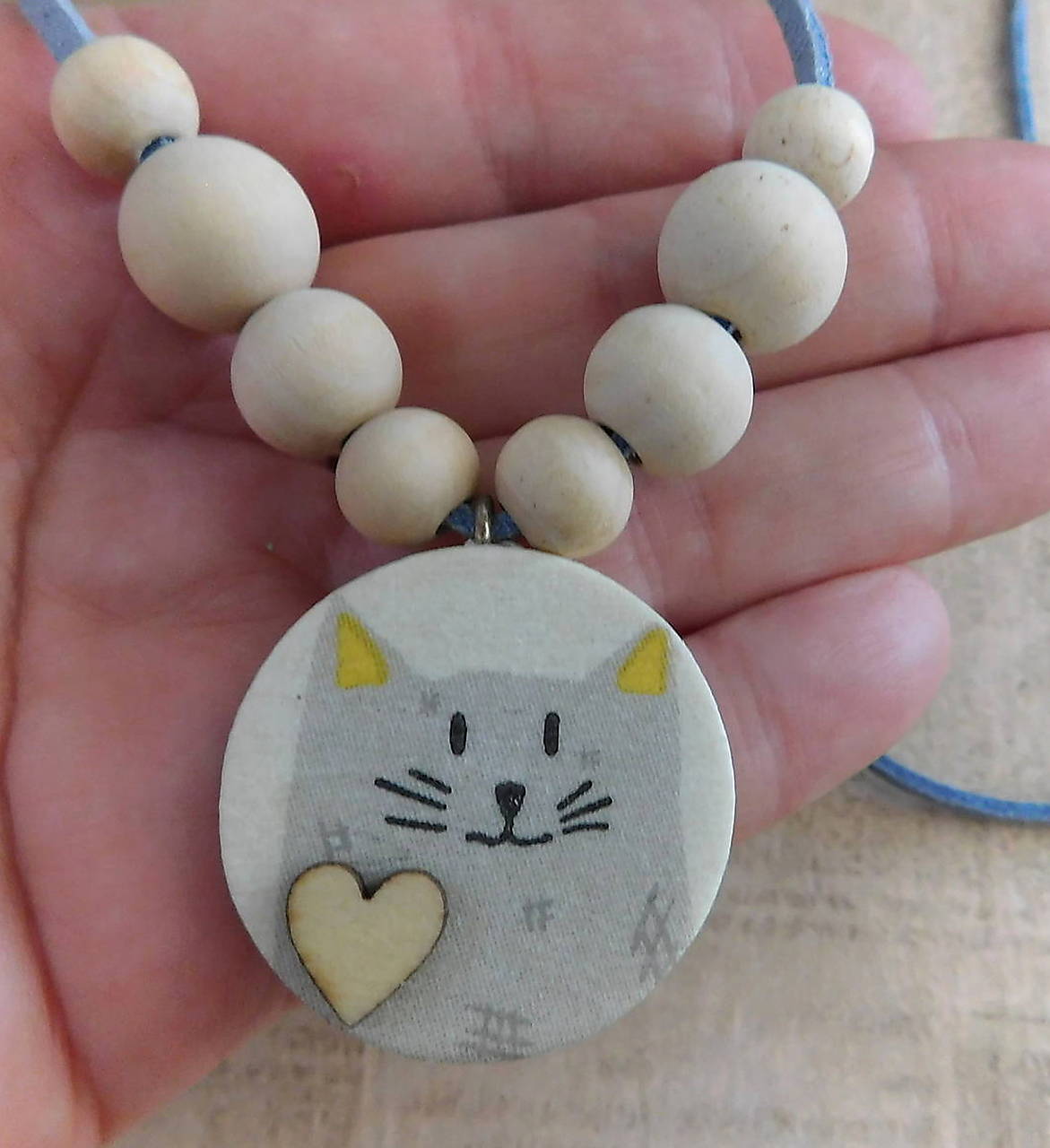 drevený náhrdelník mačička prívesok technika decoupage, mačička z oboch strán, lícna strana je so srdiečkom, drevené prírodné korálky 3 veľkostí, jemne krémovej farby, šnúrka kožená semiš,prívesok priemer 30mm, hrúbka cca 4mm, šnúrka 2x 50cm, uviažeme ako chceme, pekné ako predĺžený i kratší, kombinujte s náusničkami na obr,.dolu