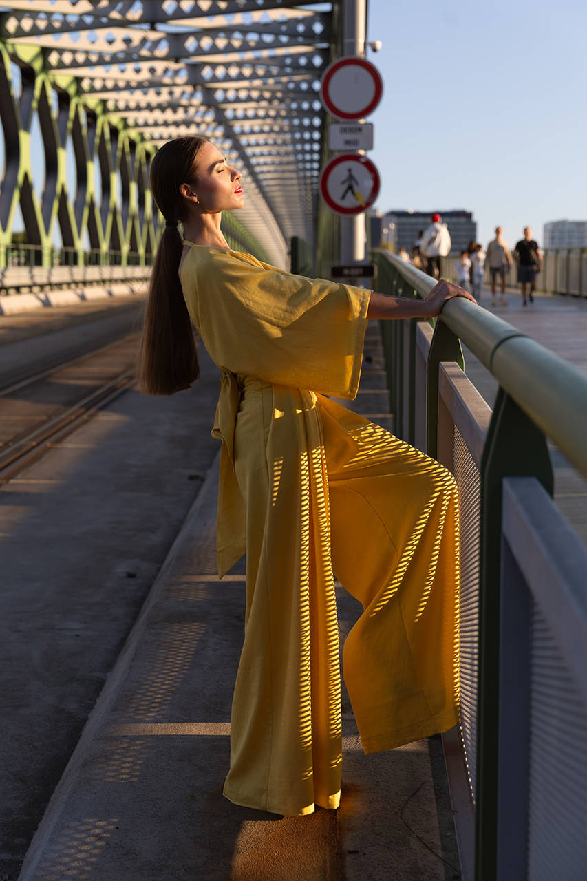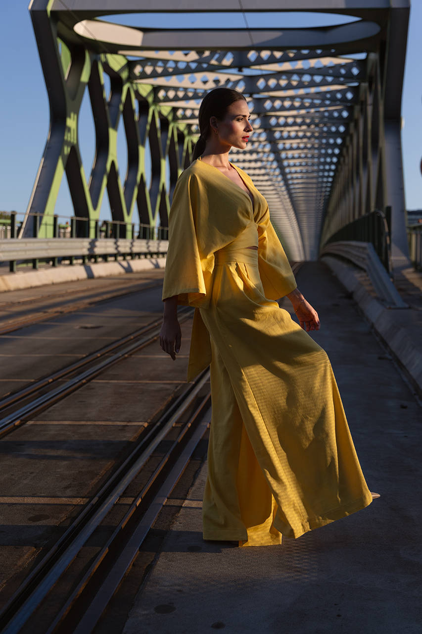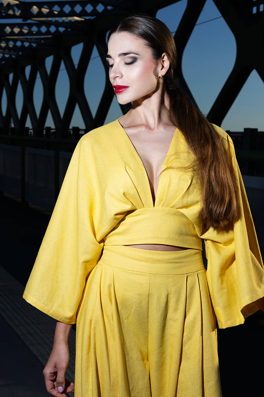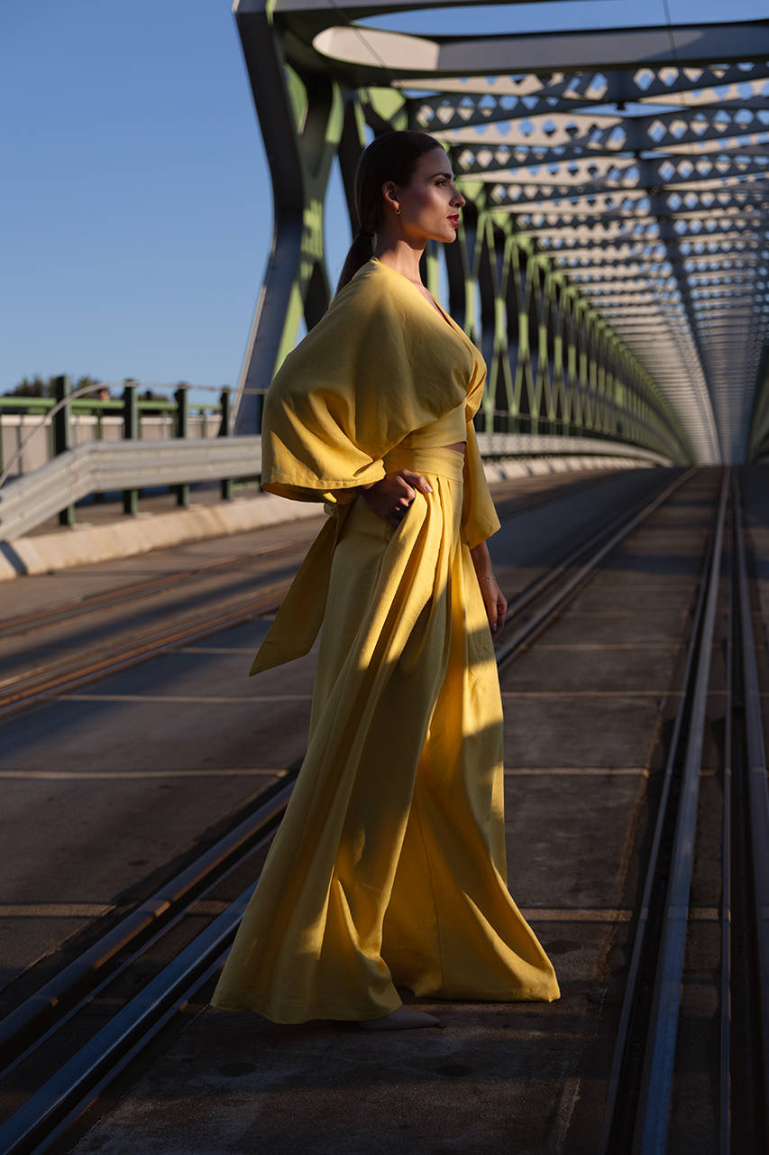 Komplet z exkluzívneho ľanového materiálu. Elegantné široké nohavice so zapínaním na boku výborne sedia a tvarujú postavu.
