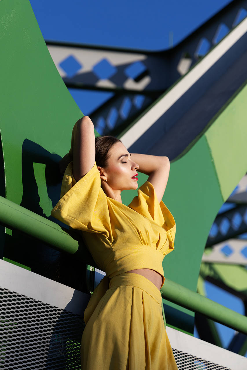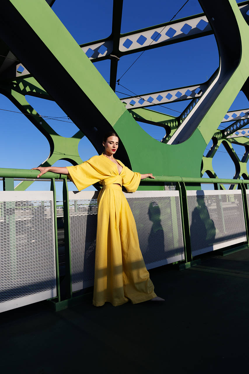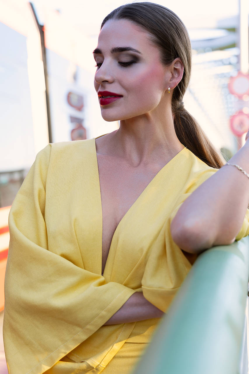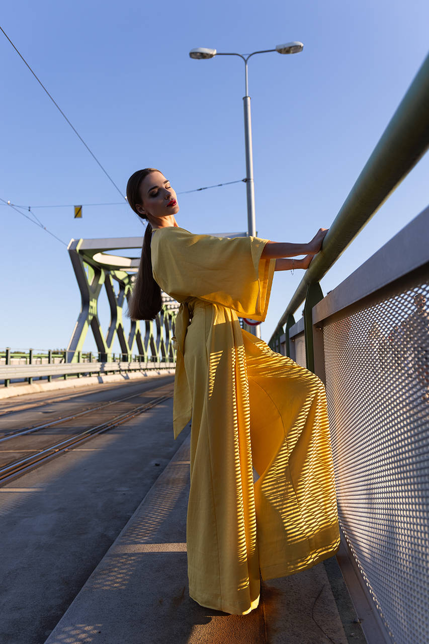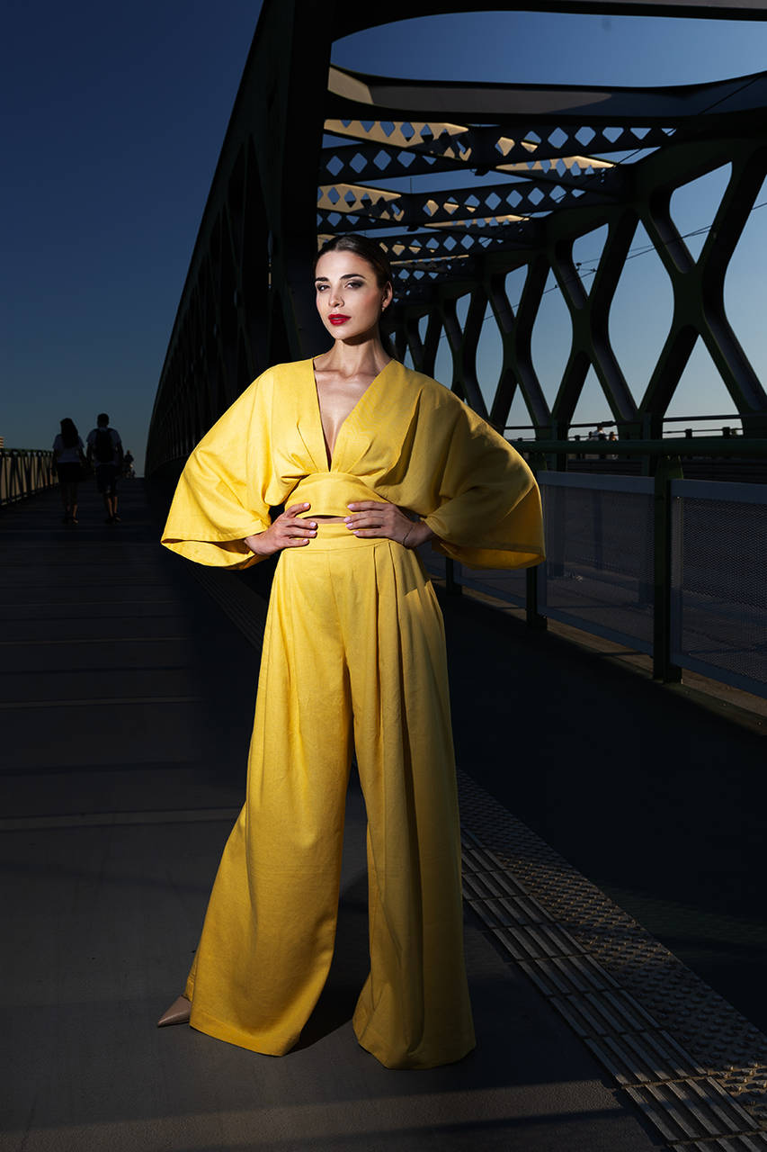 Komplet z exkluzívneho ľanového materiálu. Elegantné široké nohavice so zapínaním na boku výborne sedia a tvarujú postavu.
