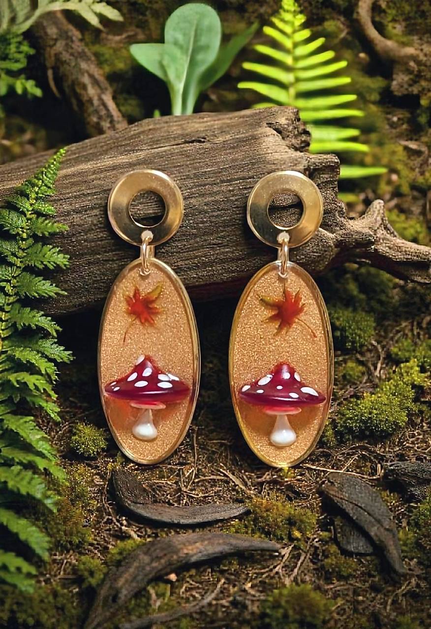 Náušnice sú vyrobené z kovových komponentov v tvare oválov zlatej farby. Do nich sú zalievané ručne modelované muchotrávky. Podkladová živica je zlatá s perleťovým nádychom.