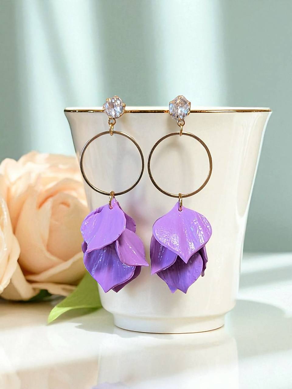 Lupienky na náušniciach sú ručne modelované z polymérovej hmoty. Strapcovito sú zavesené na kruhových komponentoch zlatej farby. Napichovacie puzety sú z nerezovej ocele, zdobené zirkónmi.