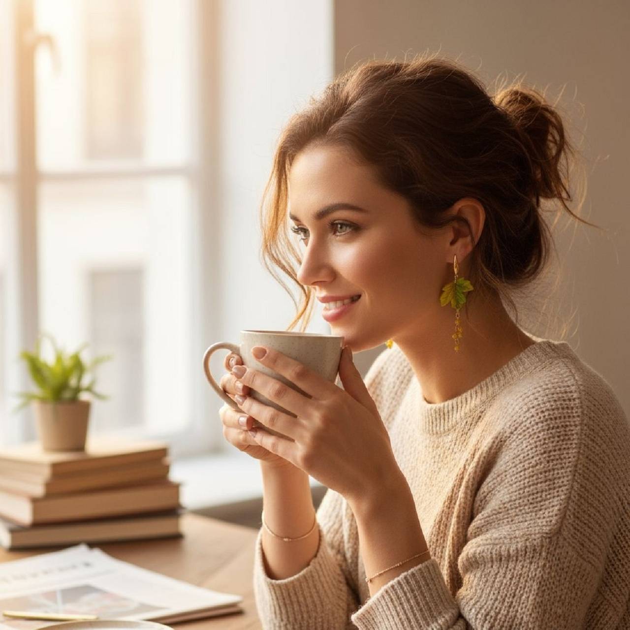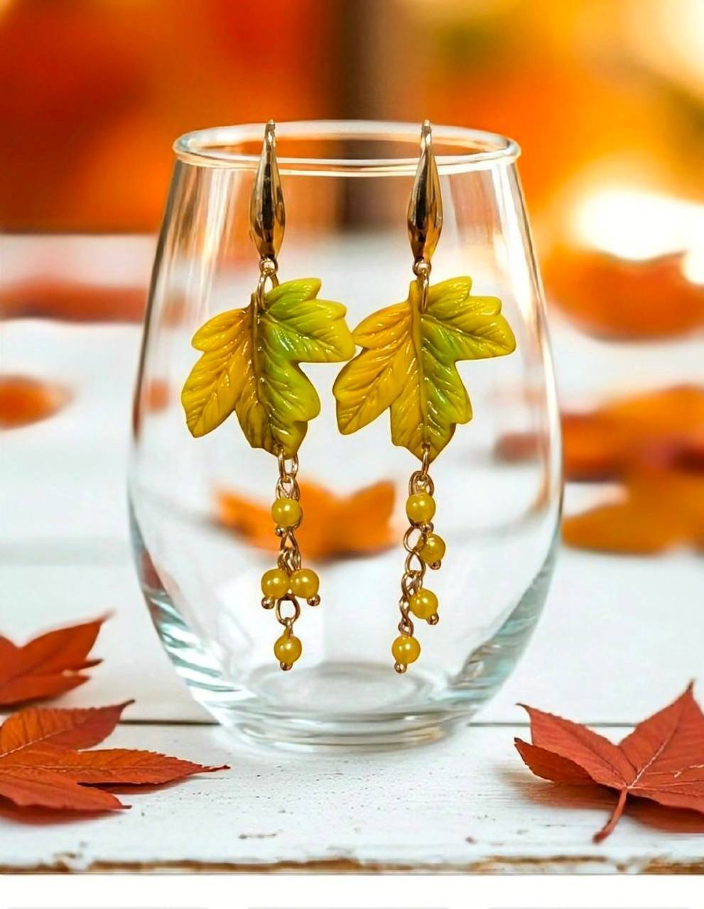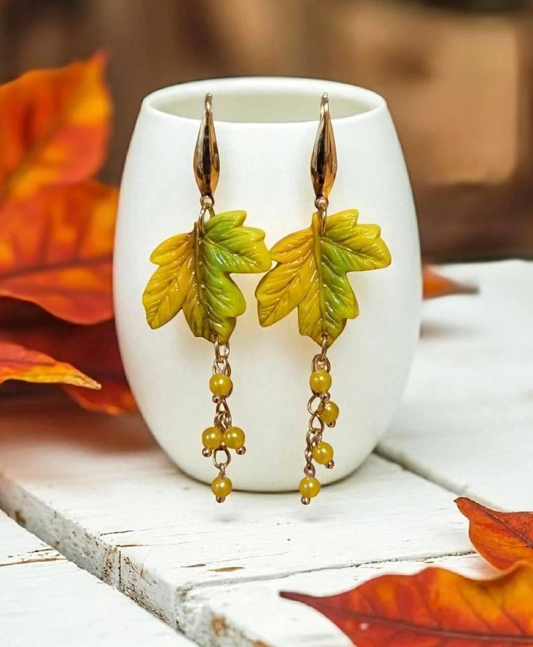 Náušnice sú vyrobené z listov žlto-zelenej farby, ktoré sú vymodelované z polymérovej hmoty. Ozdobené sú retiazkami z nerezovej ocele, a voskovanými perličkami žltej farby. Kvalitné háčiky sú vyrobené z nerezovej ocele.