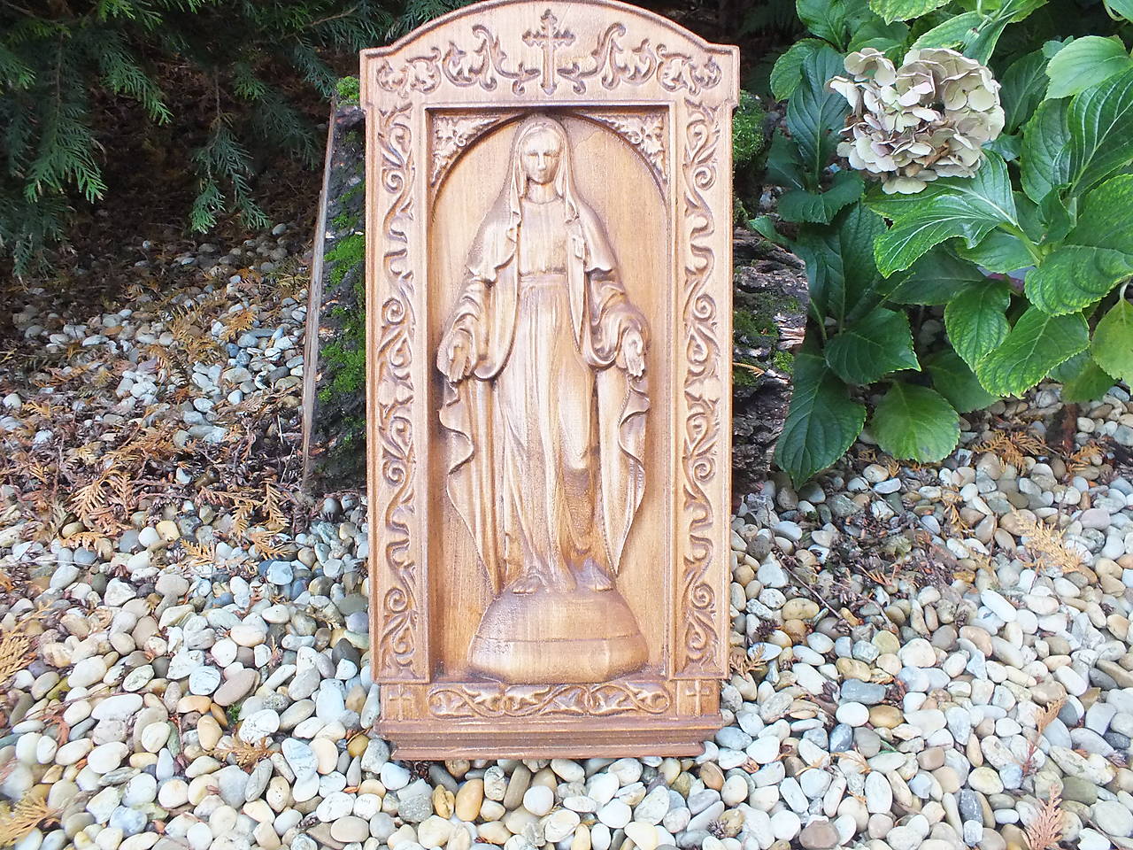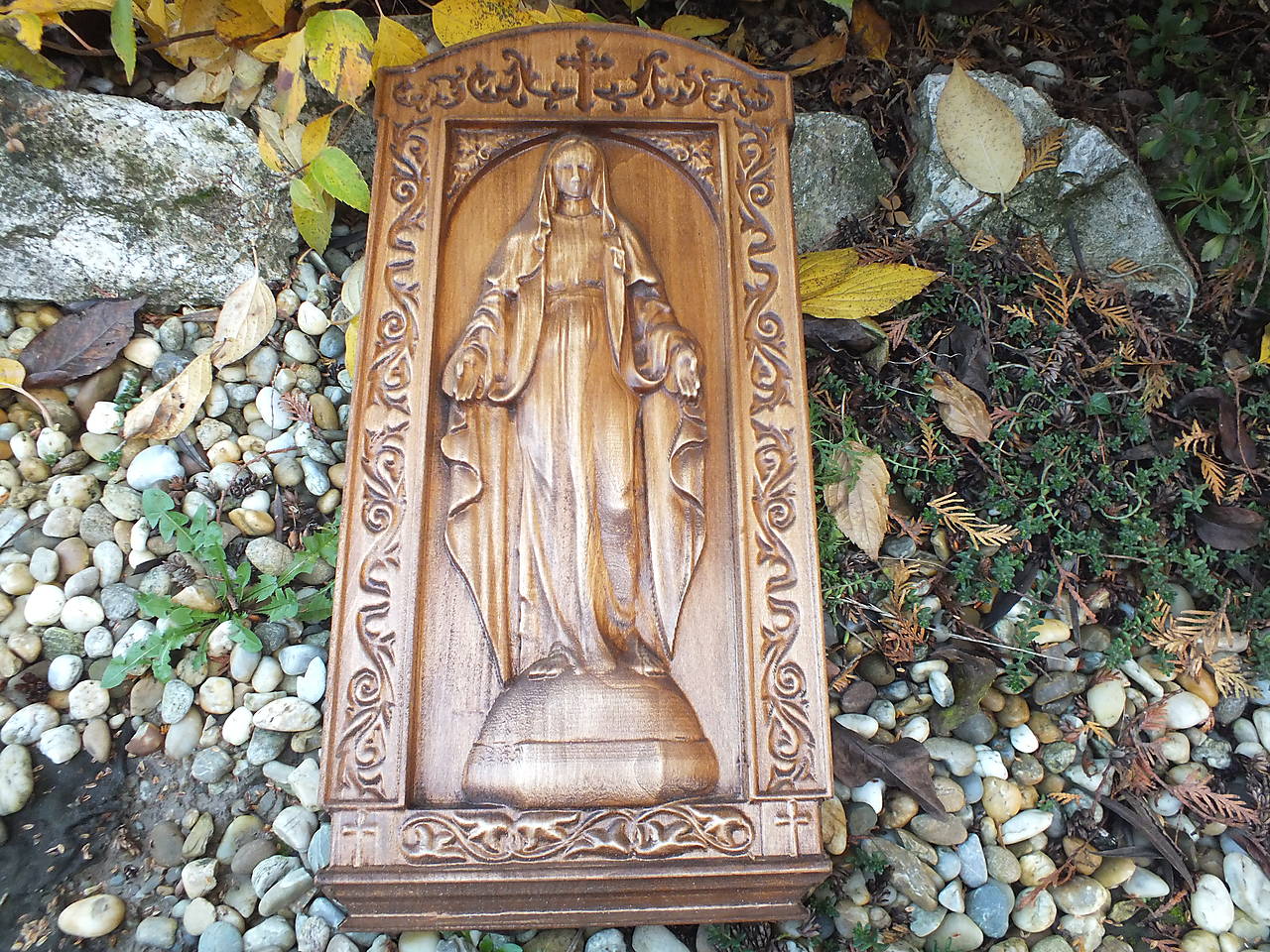Panna Mária je vyrezaná do lipového dreva. Obraz je maľovaný a nalakovaný.