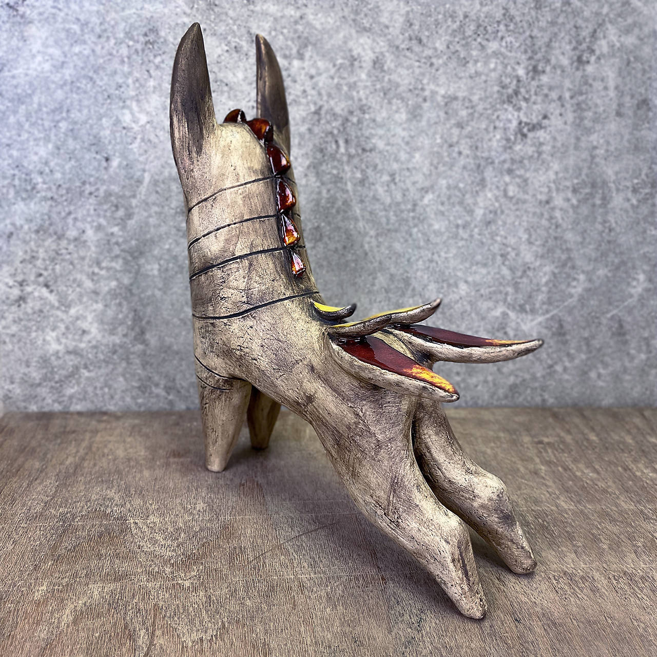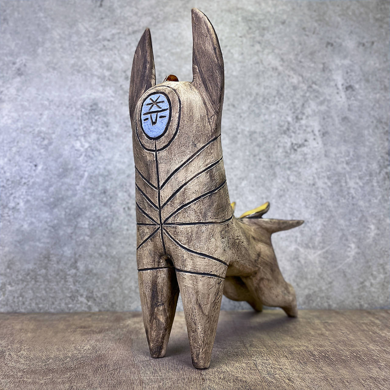 Povrchová úprava zahŕňa patinu burelu, ktorá zvýrazňuje textúru povrchu v kombinácii so žiarivými červeno-žltými glazúrami a modrou tvárou.