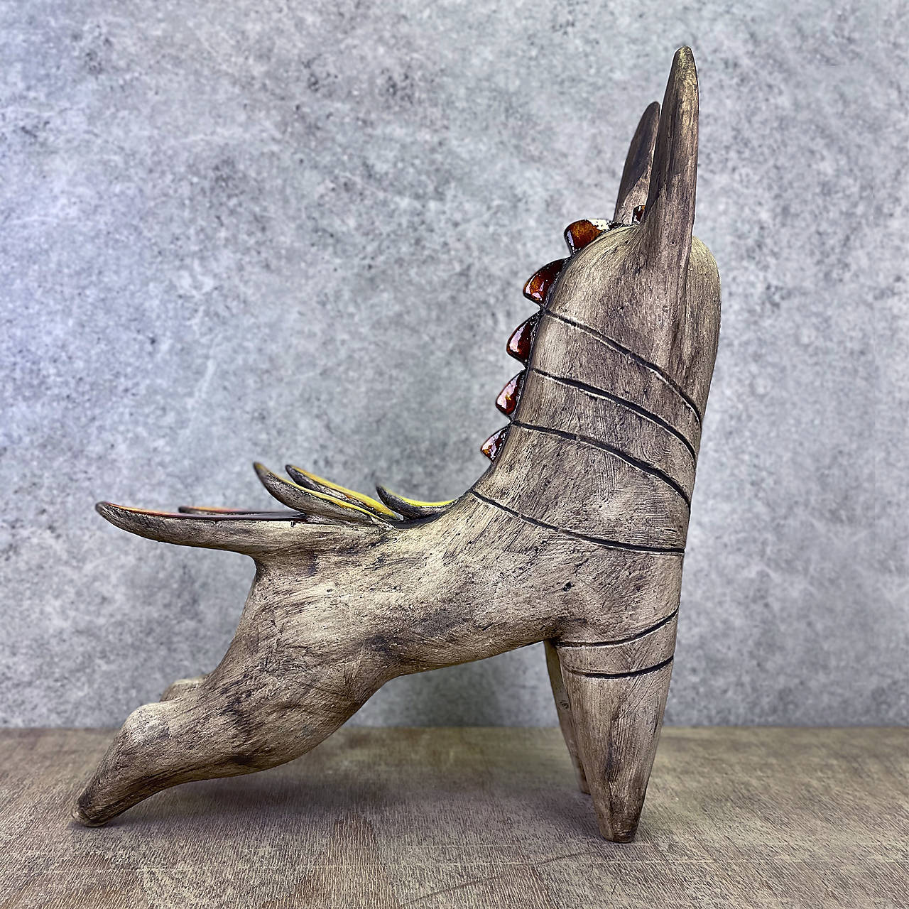 Ručne modelovaná keramická socha predstavuje jedinečné umelecké dielo, ktoré spája zvieracie a ľudské elementy v podobe mýtického tvora. Táto bytosť, nesúca charakteristické črty inteligencie a personifikácie, symbolizuje novodobého kentaura – harmonické spojenie dvoch svetov, prírodného a ľudského, ktoré sa stretávajú na hranici reality a fantázie.