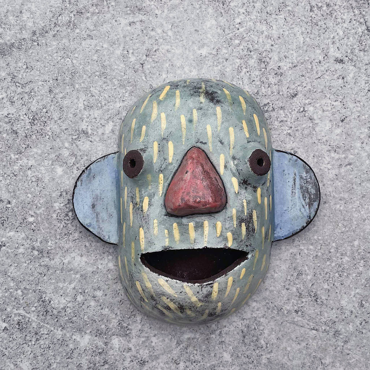Táto ručne modelovaná keramická maska je jedinečný a hravý doplnok, ktorý oživí každý priestor. Povrch je dokončený burelom a farebnými engobami, ktoré jej dodávajú živé farby a jedinečný charakter. Maska je dutá, so zadným otvorom, ktorý umožňuje jednoduché zavesenie na stenu.