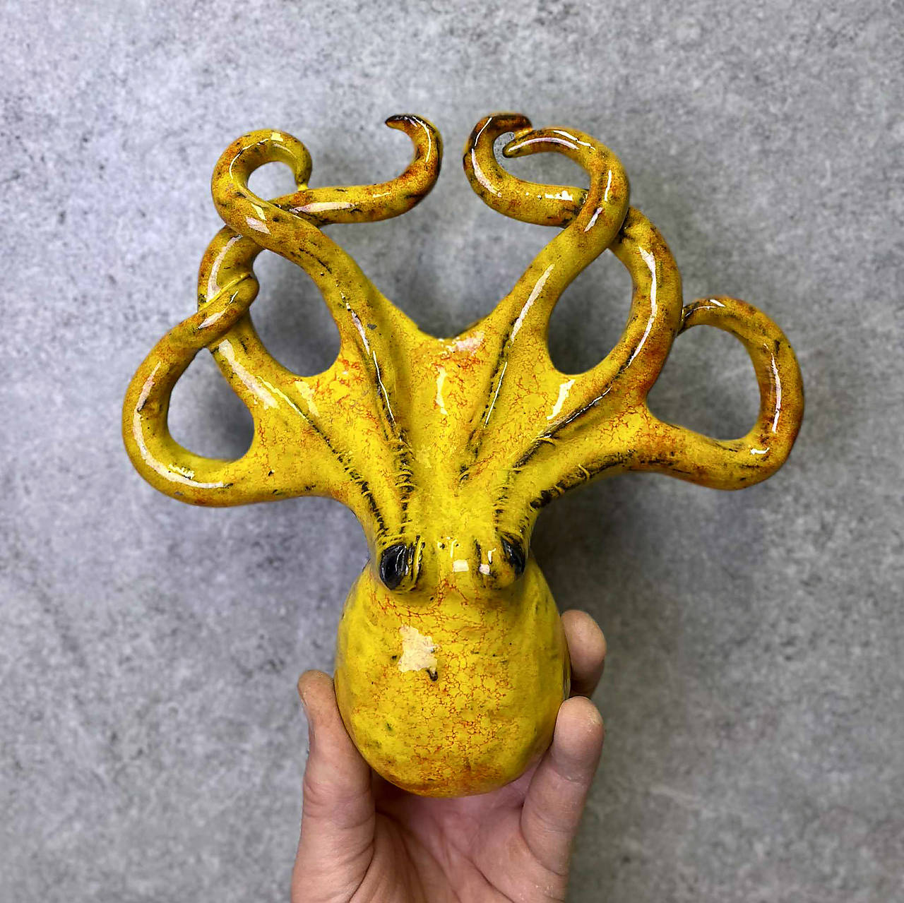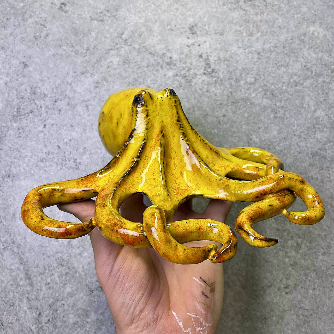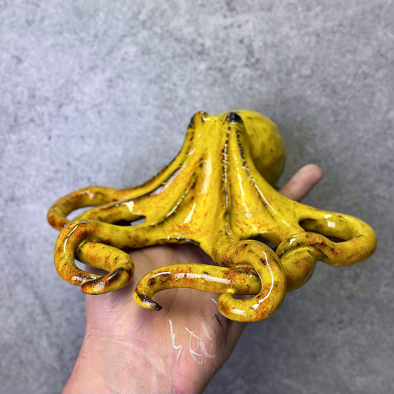 Ručne modelovaná keramická socha chobotnice dokončená žiarivou žltou glazúrou. Socha môže byť v interiéri, ale aj exteriéri.