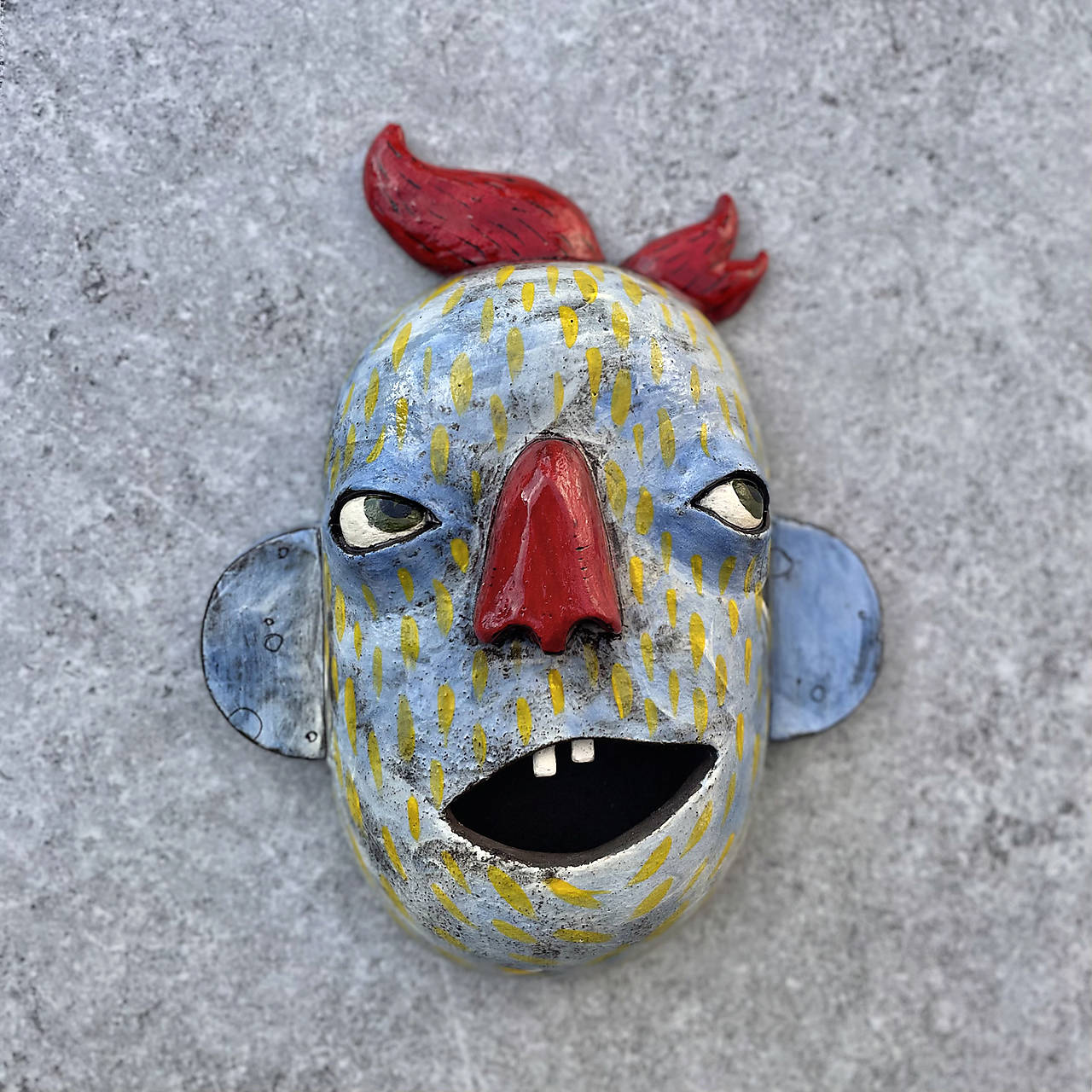 Jedinečný a hravý doplnok, ktorý oživí každý priestor. Je ručne modelovaná a povrch je dokončený burelom a farebnými engobami, ktoré jej dodávajú živé farby a jedinečný charakter. Maska je dutá, so zadným otvorom, ktorý umožňuje jednoduché zavesenie na stenu.