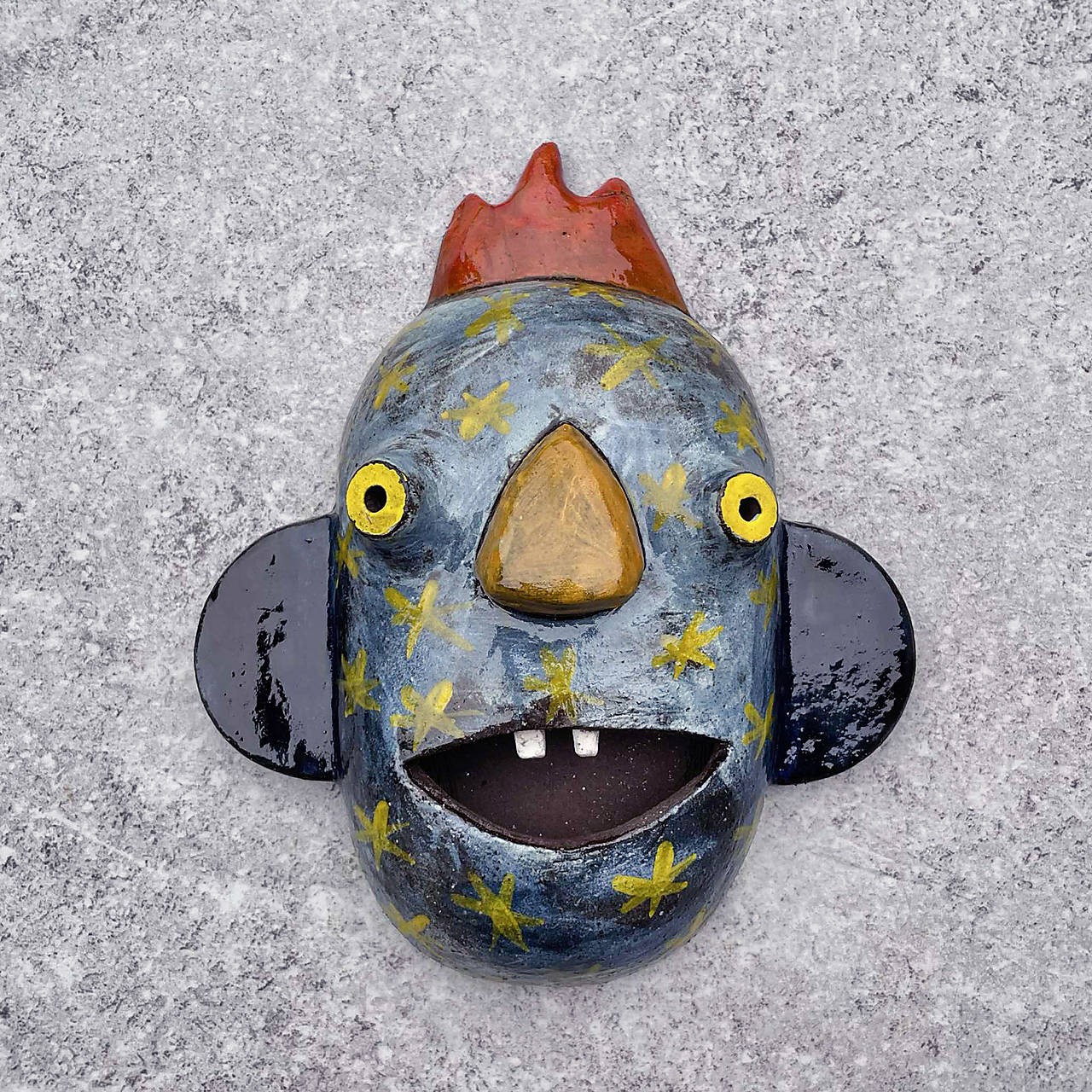 Jedinečný a hravý doplnok, ktorý oživí každý priestor. Je ručne modelovaná a povrch je dokončený burelom a farebnými engobami, ktoré jej dodávajú živé farby a jedinečný charakter. Maska je dutá, so zadným otvorom, ktorý umožňuje jednoduché zavesenie na stenu.