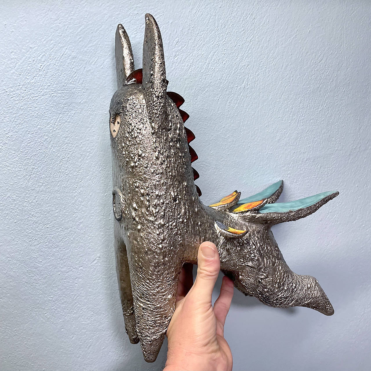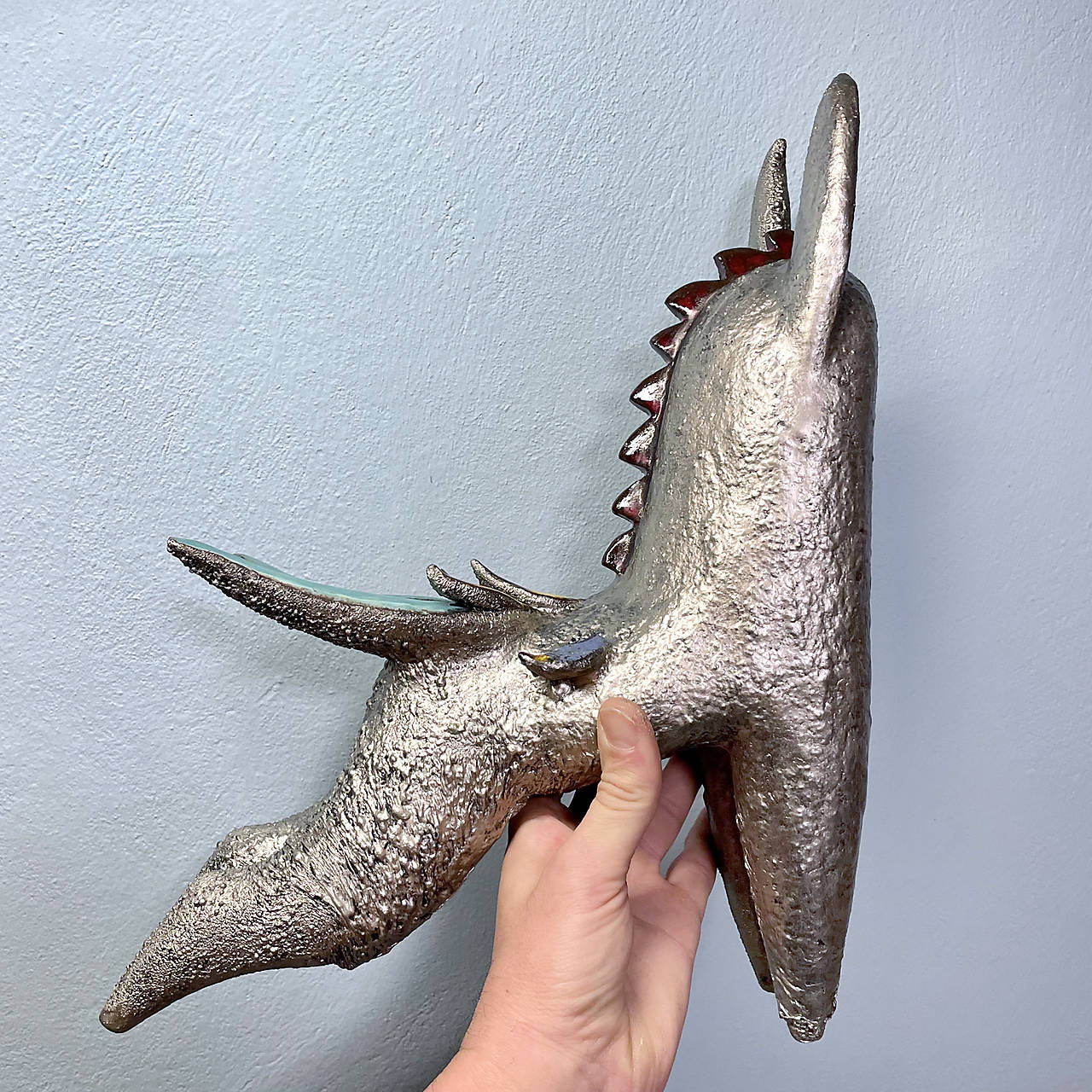 Povrchová úprava zahŕňa v detailoch bielu engobu a farebné glazúry, ale najmä glazúru v krásnom striebornom prevedení so štruktúrovaným povrchom, ktorý vytvára dojem žiarivého kovového lesku a prehlbuje vizuálnu dynamiku.