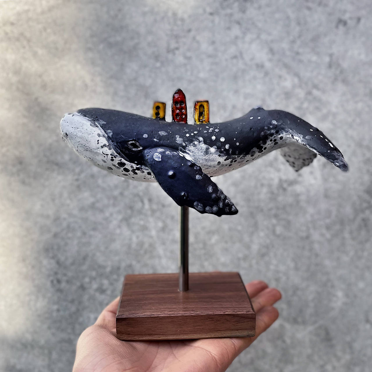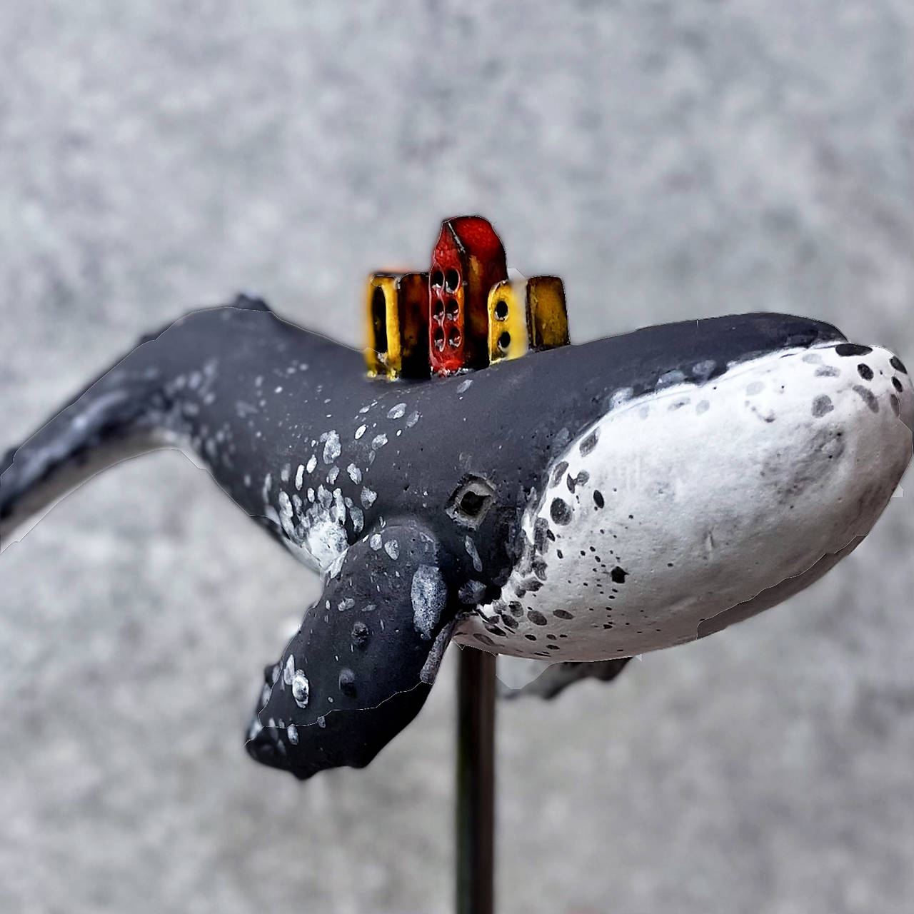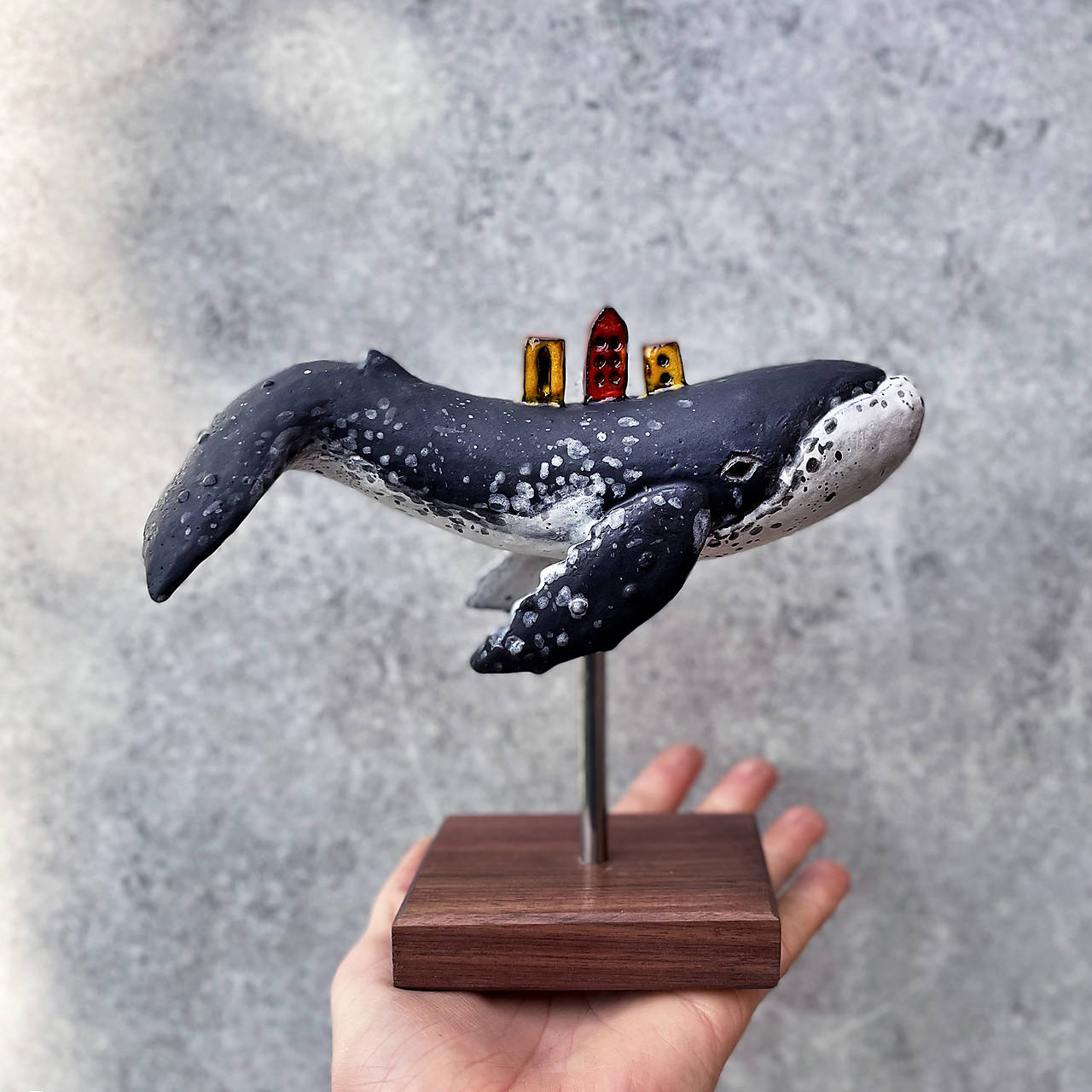 Ručne modelovaná keramická socha veľryby vráskavca dlhoplutvého s malým mestom na chrbte. Socha je upevnená na drevenom podstavci,