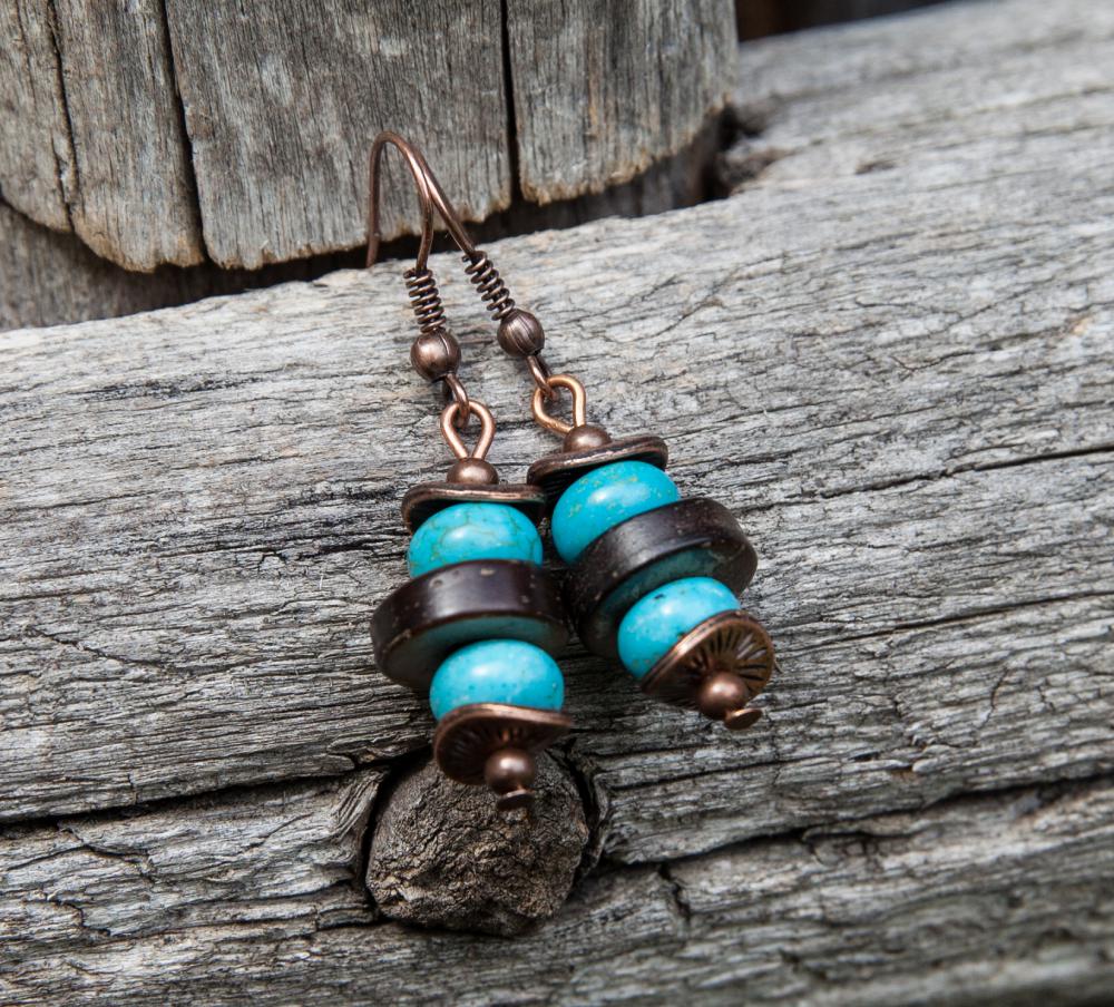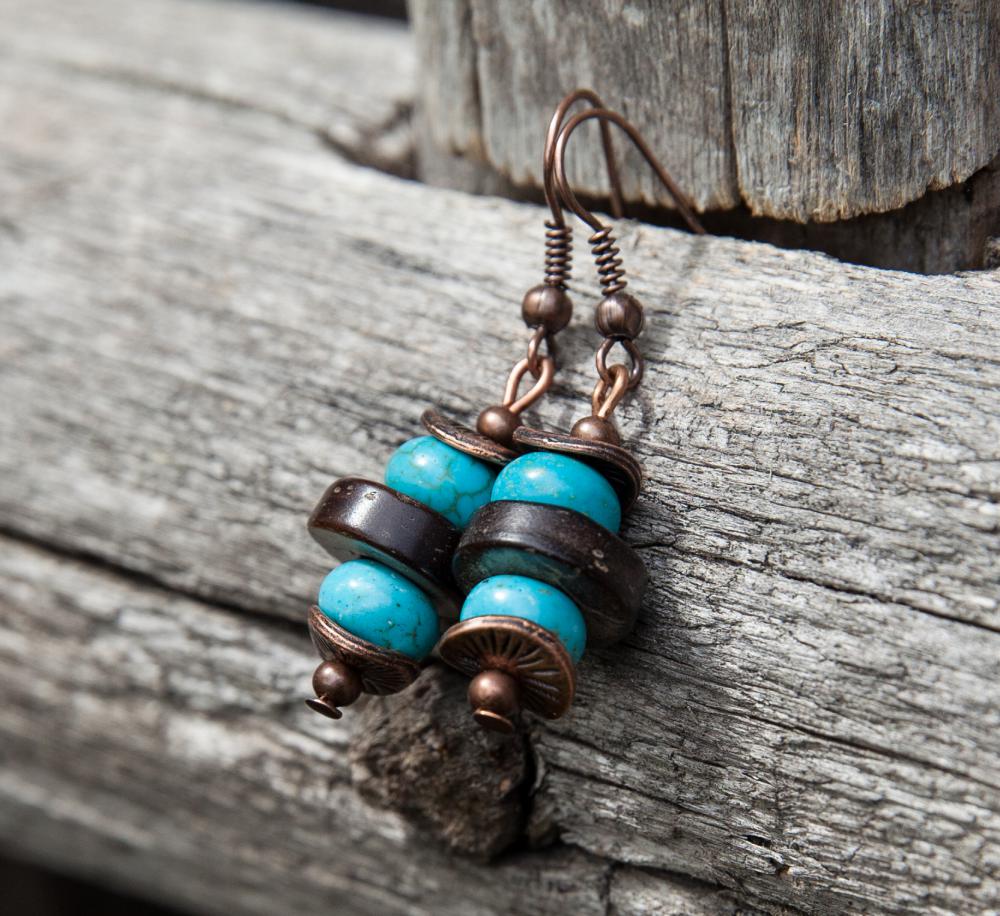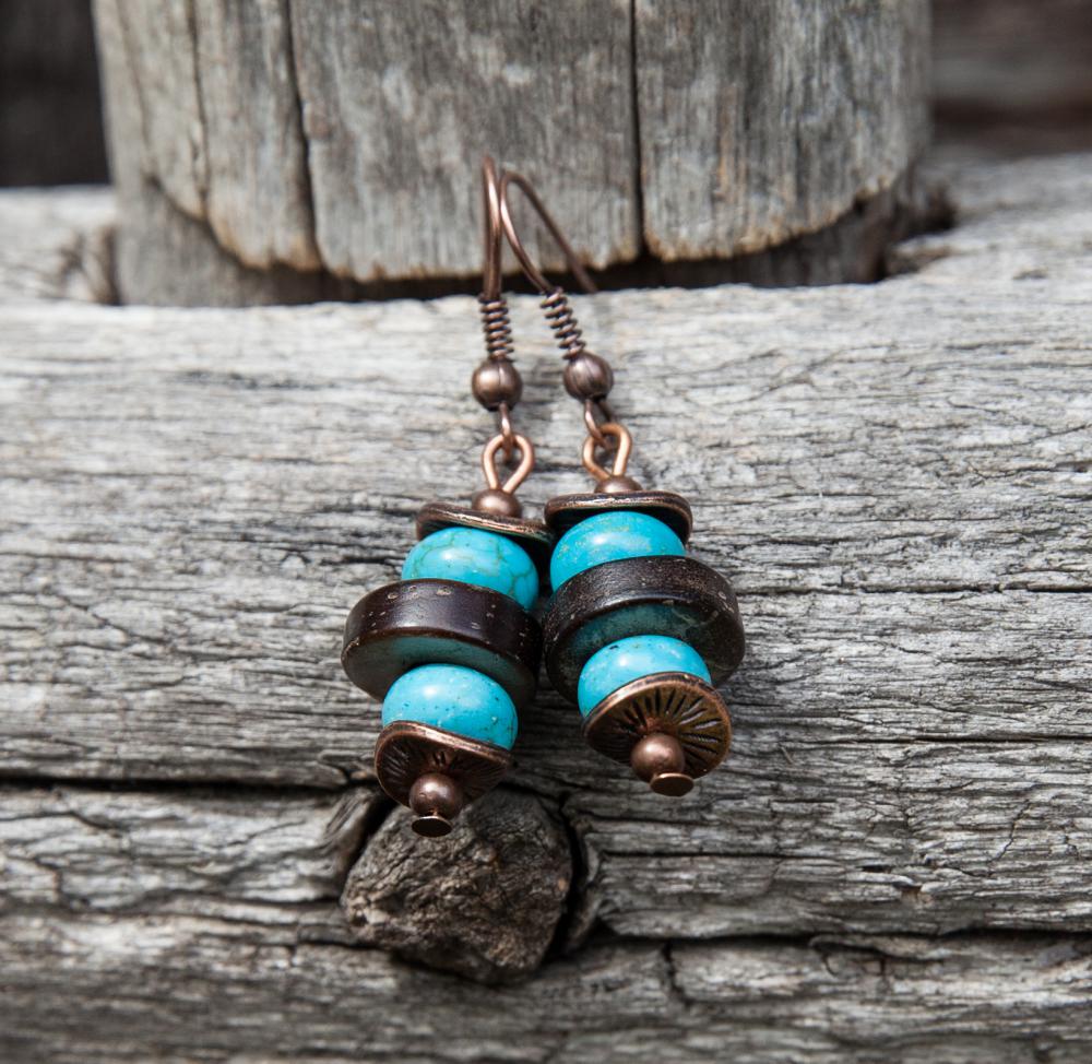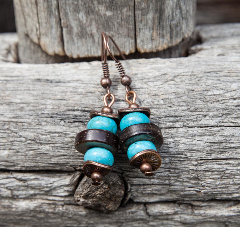 Svieže letné náušnice z hnedých prírodných kokosových korálok, doplnené rondelkami tyrkysu, medenými kaplíkmi a guličkami.