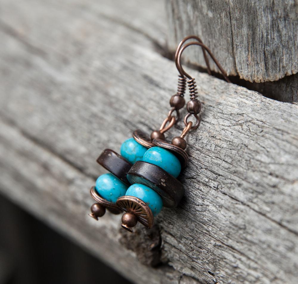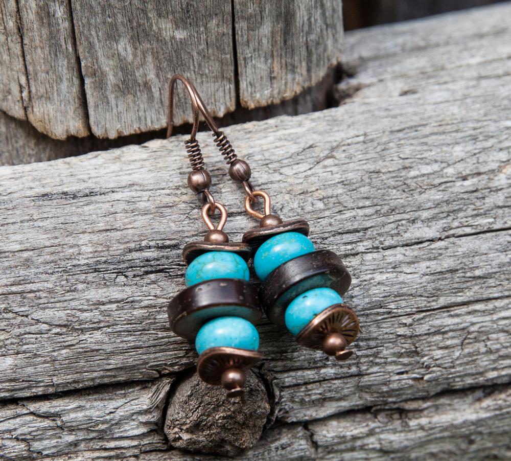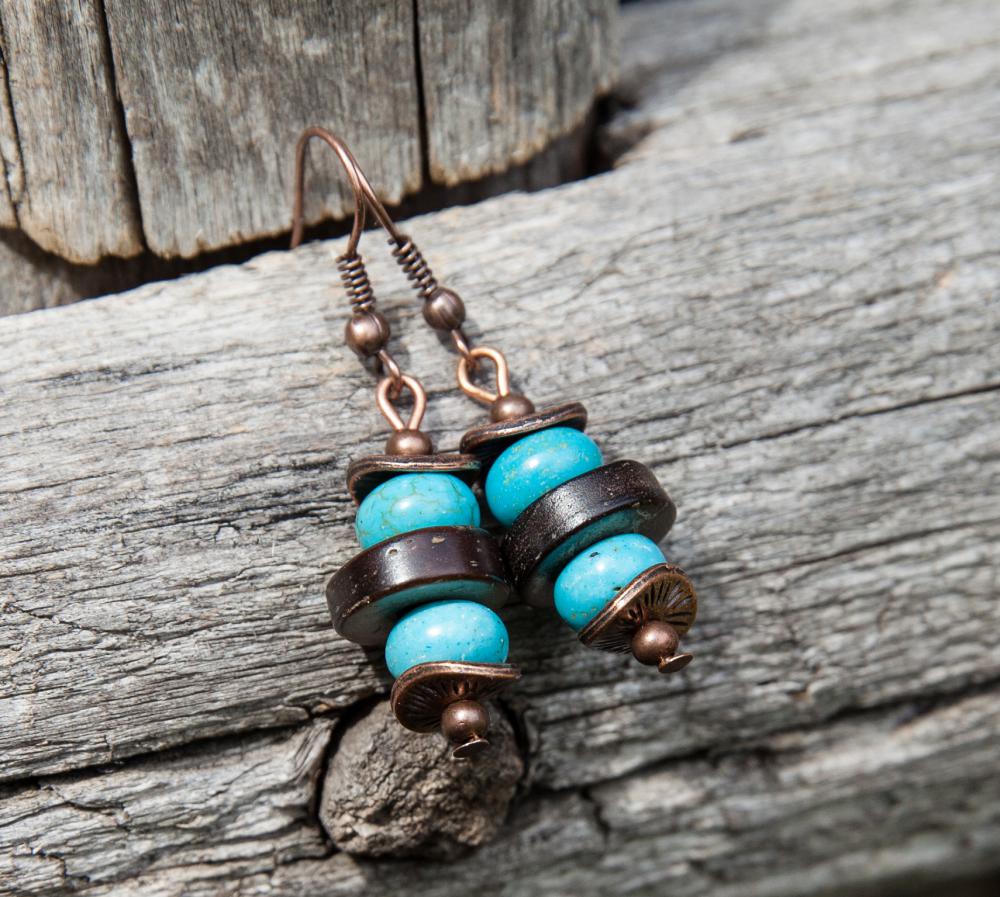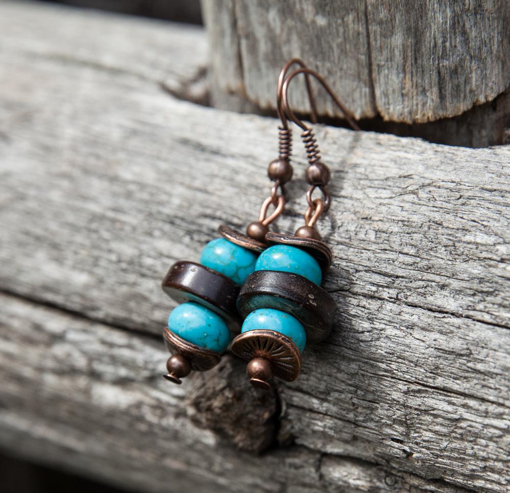 Svieže letné náušnice z hnedých prírodných kokosových korálok, doplnené rondelkami tyrkysu, medenými kaplíkmi a guličkami.
