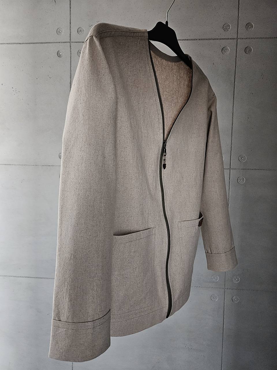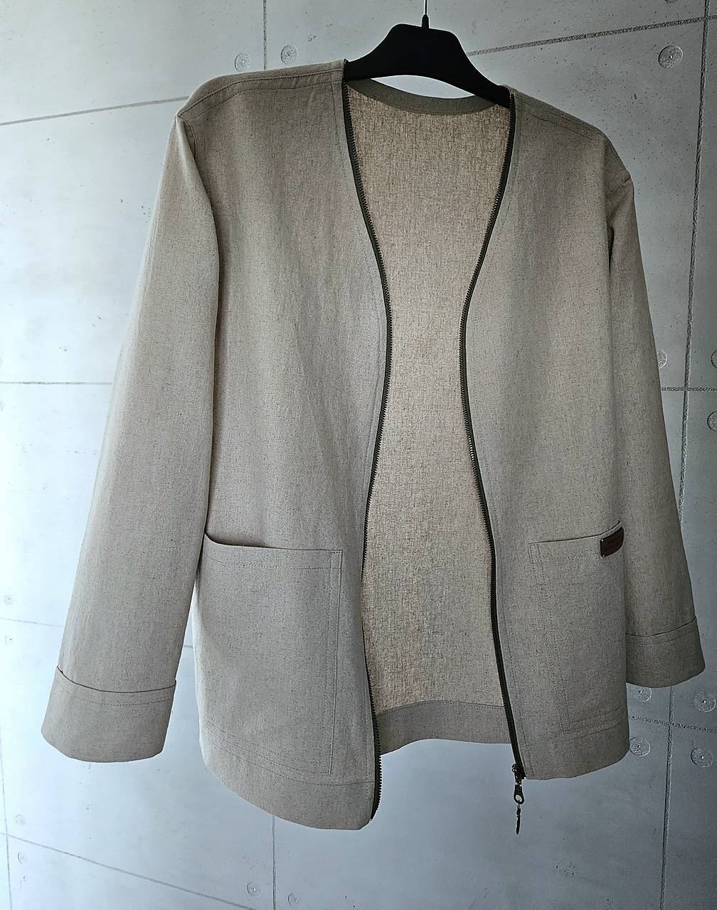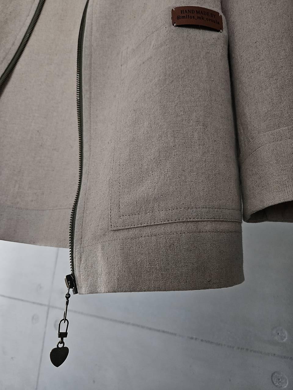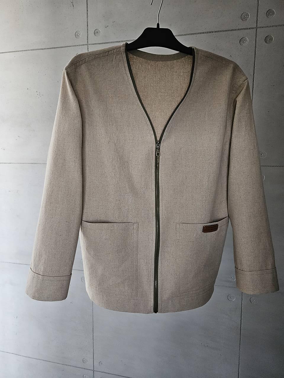 Sako má rovný strih, v páse je mierne vytvarované. Na predných dieloch sú veľké efektné vrecká, rukávy sú ukončené manžetou. V-éčkový výstrih je olemovaný kontrastným zeleným zipsom.