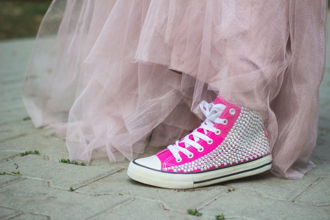 Pamätáte si tie americké svadby, kde sú všetky družičky rovnaké? Na Slovensku to síce nie je až takým zvykom, ale snažíme sa aspoň mať, na niektorých svadbách družičky v rovnakých farbách. Čo tak to trochu ozvláštniť? :) Čo keby mala každá družička svoje kamienkové tenisky k outfitu? Možno pre niekoho šialenosť, ale prečo nie? Prípadne sa chystáte na svadbu ako hosť a neviete čo na seba? Kto povedal, že pod tou peknou tylovou sukňou nemôžu byť vaše obľúbené tenisky? Nikto, a ešte ak vám počas svadby občas vykuknú, verte že zaujmete okolie a pár ľudí sa príde spýtať odkiaľ ich máte…
