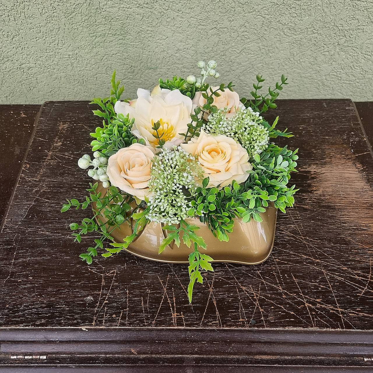 Základ ikebanky tvorí plastová miska zlatej farby, v tvare srdca, ktorej dominuje väčšia dahlia, krémovej farby.. Táto je doplnená ružami v marhuľovej farbe a množstvom zelene. Ikebanka môže byť umiestnená aj na urnový hrobček.