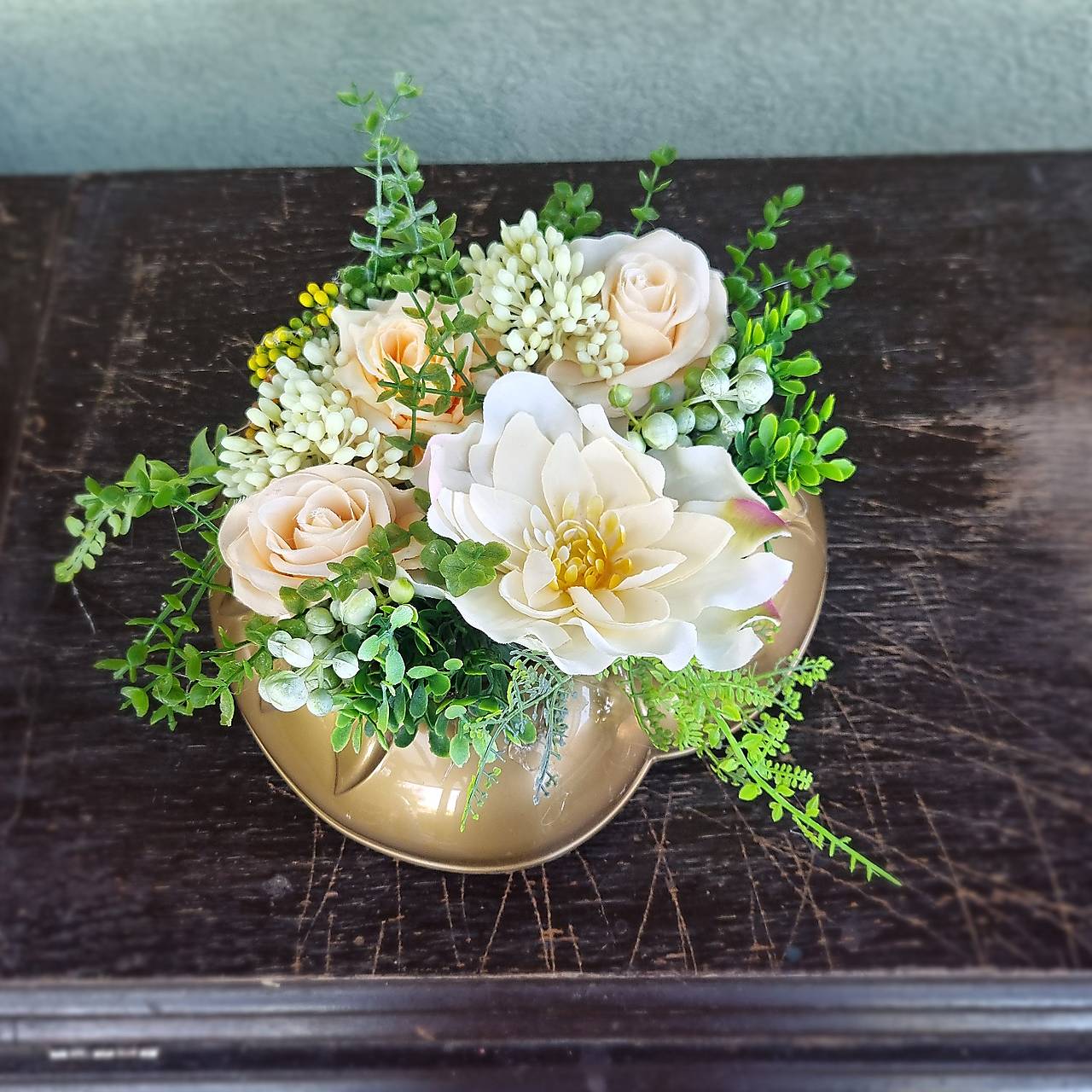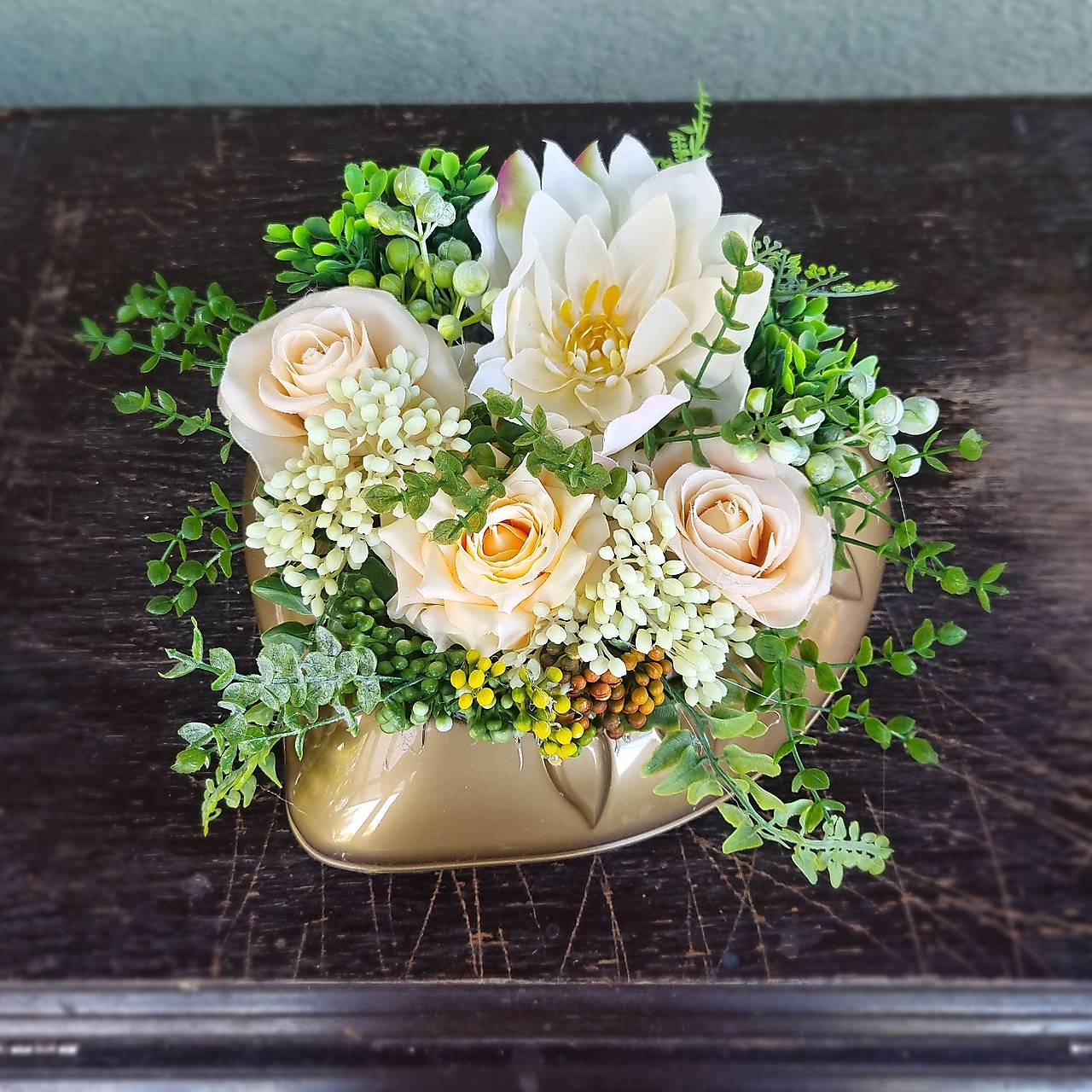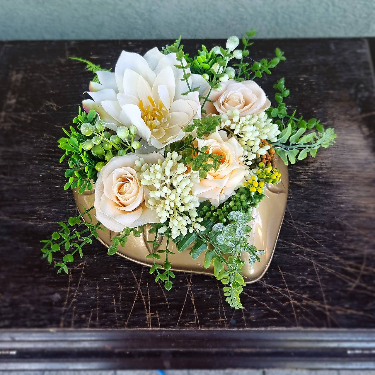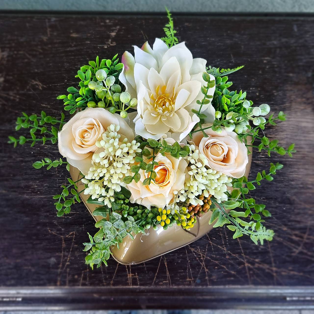 Základ ikebanky tvorí plastová miska zlatej farby, v tvare srdca, ktorej dominuje väčšia dahlia, krémovej farby.. Táto je doplnená ružami v marhuľovej farbe a množstvom zelene. Ikebanka môže byť umiestnená aj na urnový hrobček.