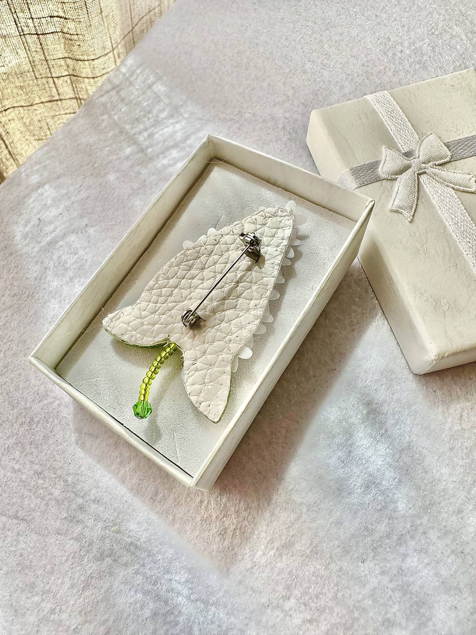 Brošňa vytvorená technikou korálkovej výšivky. Použité sú české sklenené korálky. Ako podklad sú vrstva plsti a semiš. Zapínanie na brožový mostík. Veľkosť 6.5 x 3.5 cm.