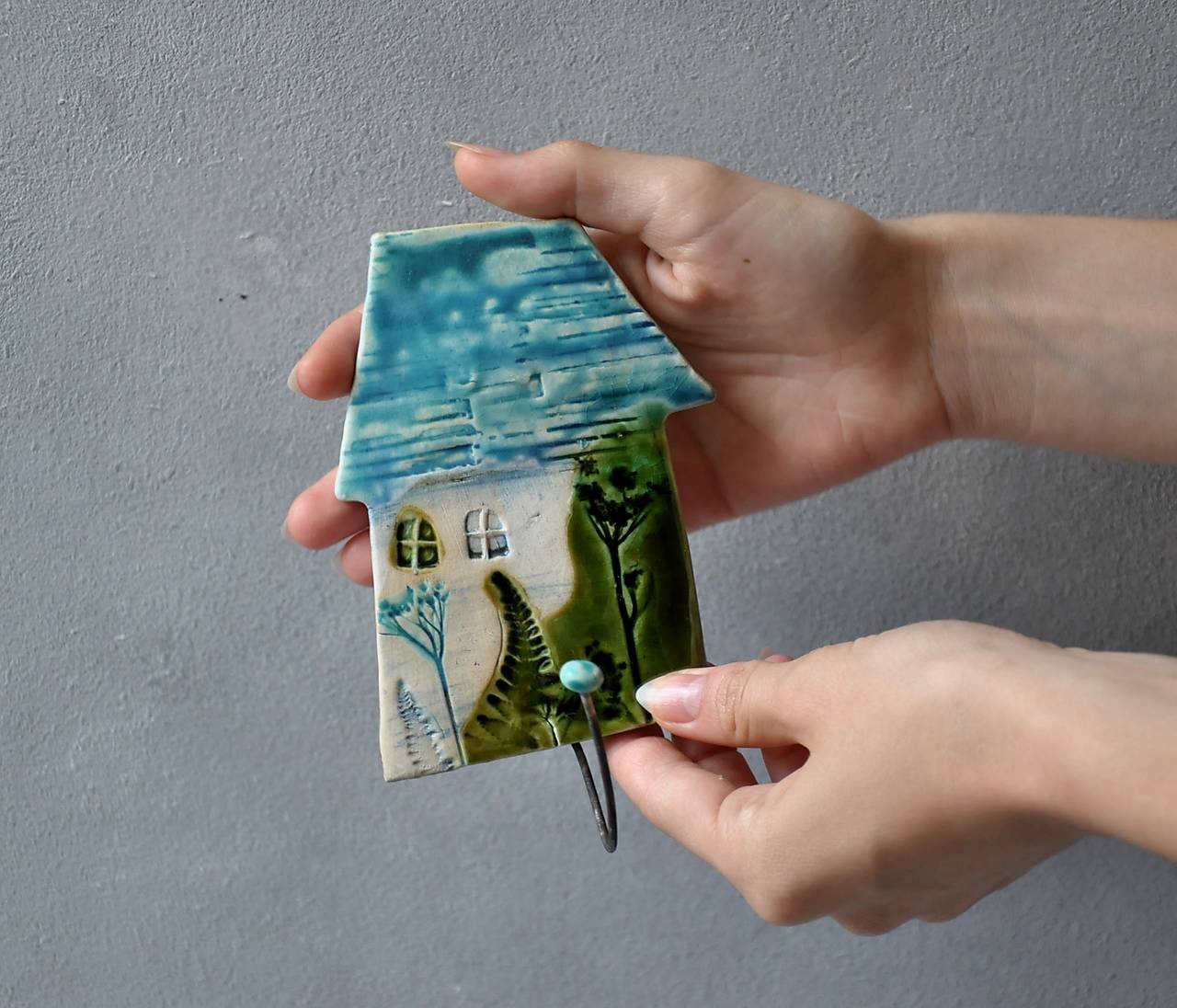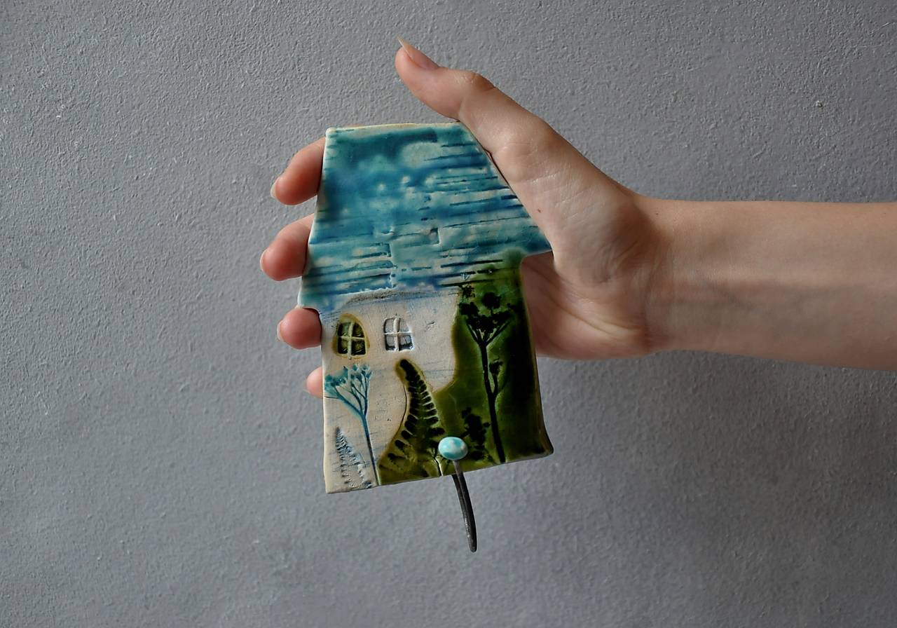 Domček má vtipné, originale, reliéfy výzdobu, ktorú tvoria kvety, ploty, stromy , okienka, ..... Vešiak má na zadnej strane 1 kovovú slučku kvôli upevneniu na stenu.