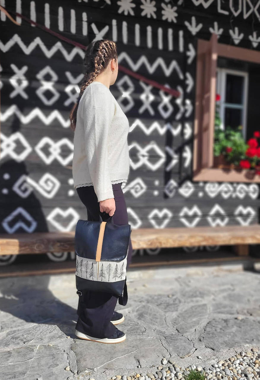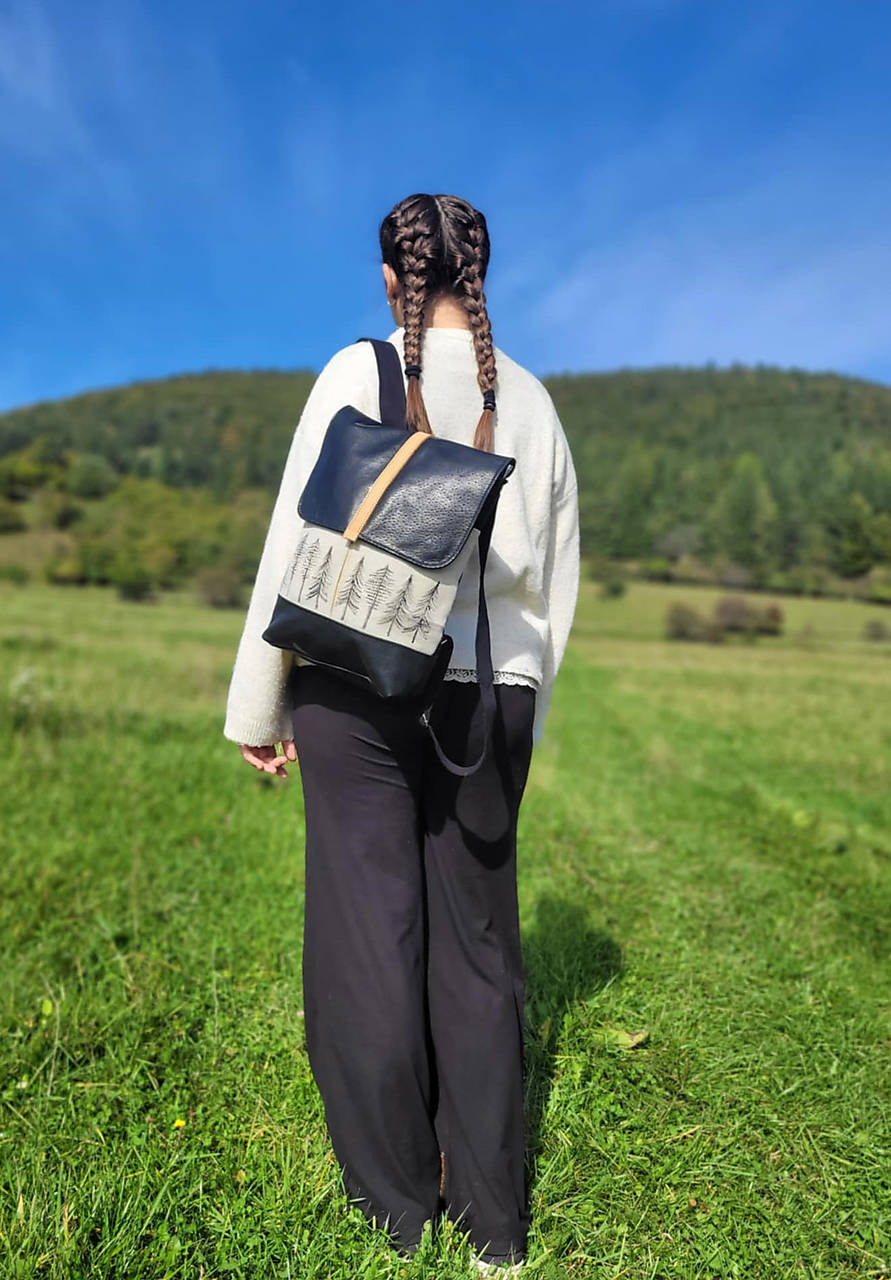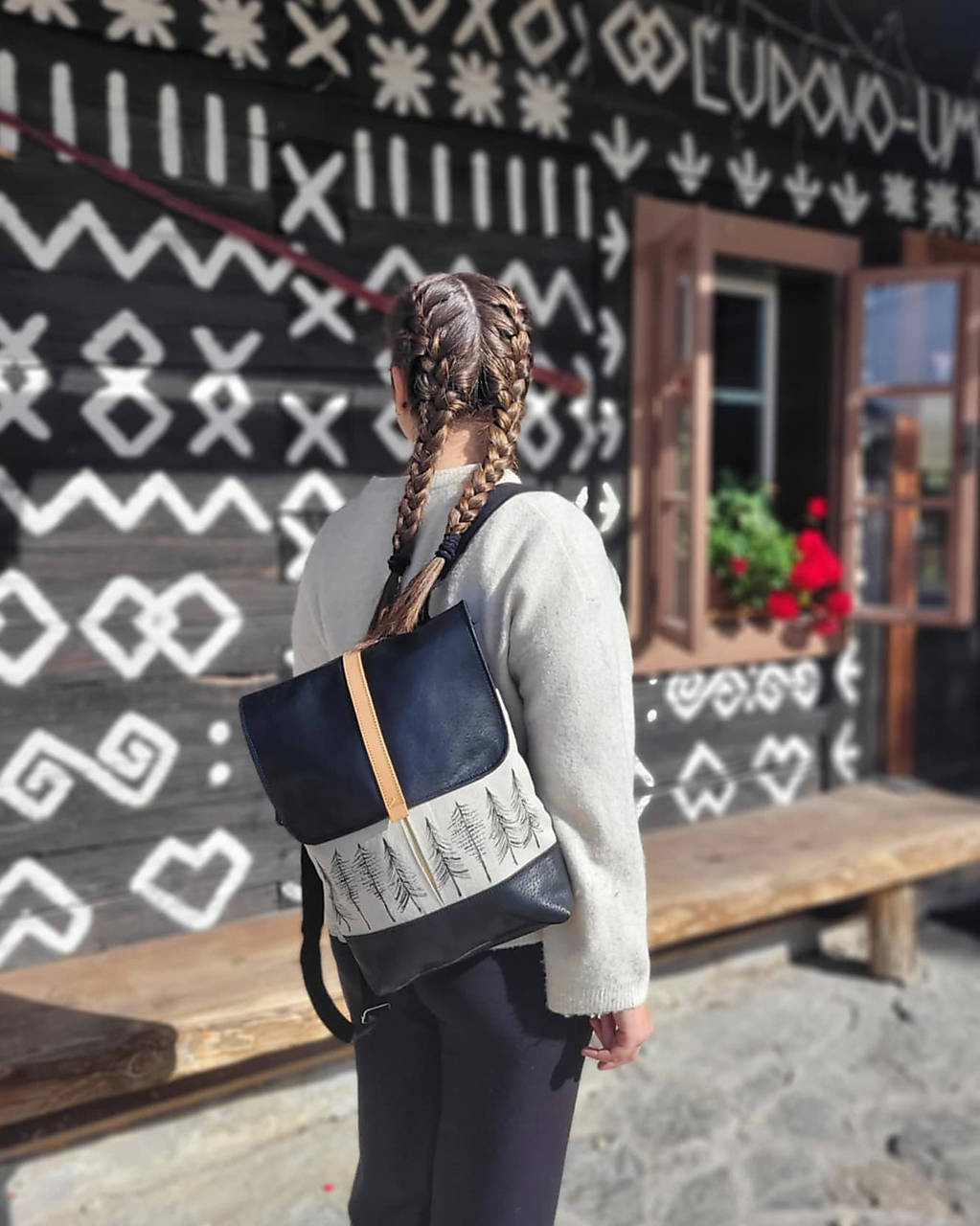 - poklop ako aj spodná časť ruksaku sú z kože. Predná vrecko je z režného plátna (ľan, bavlna) vyrobeného u nás na Slovensku, -dekorované ručne maľovanými autorskými motívmi.