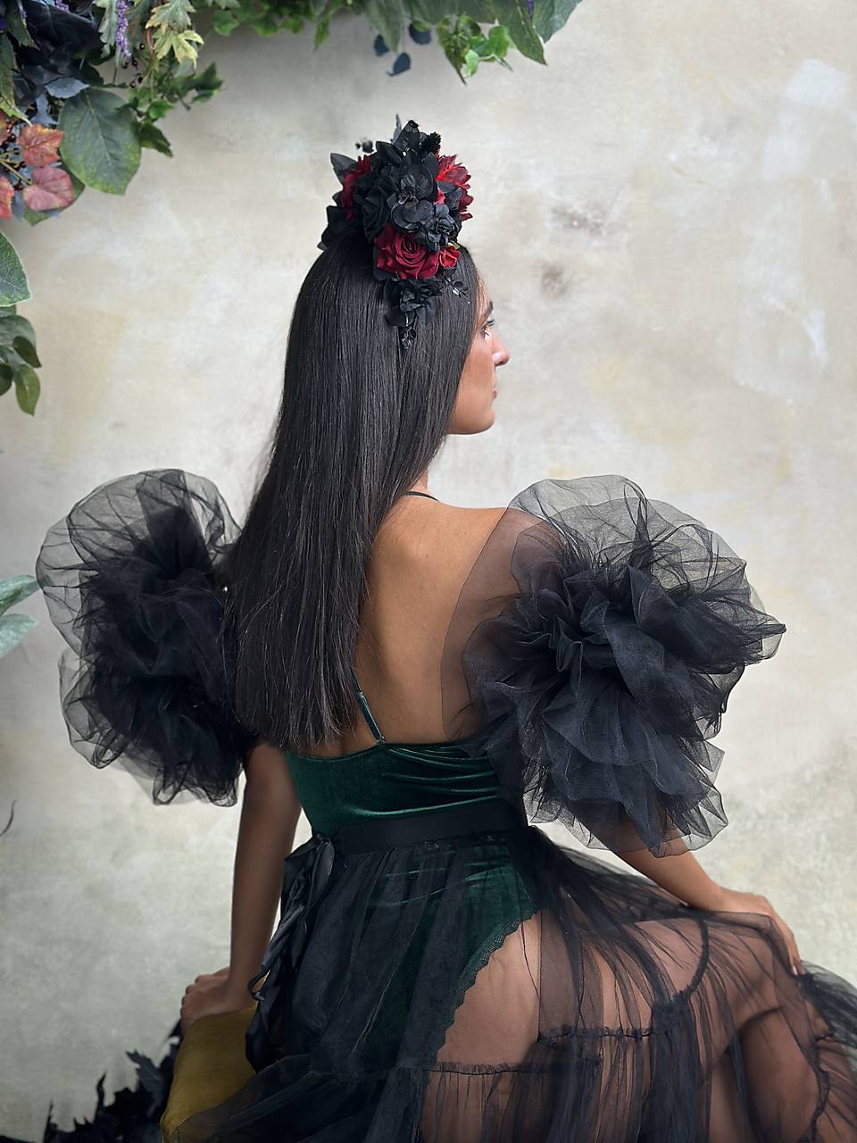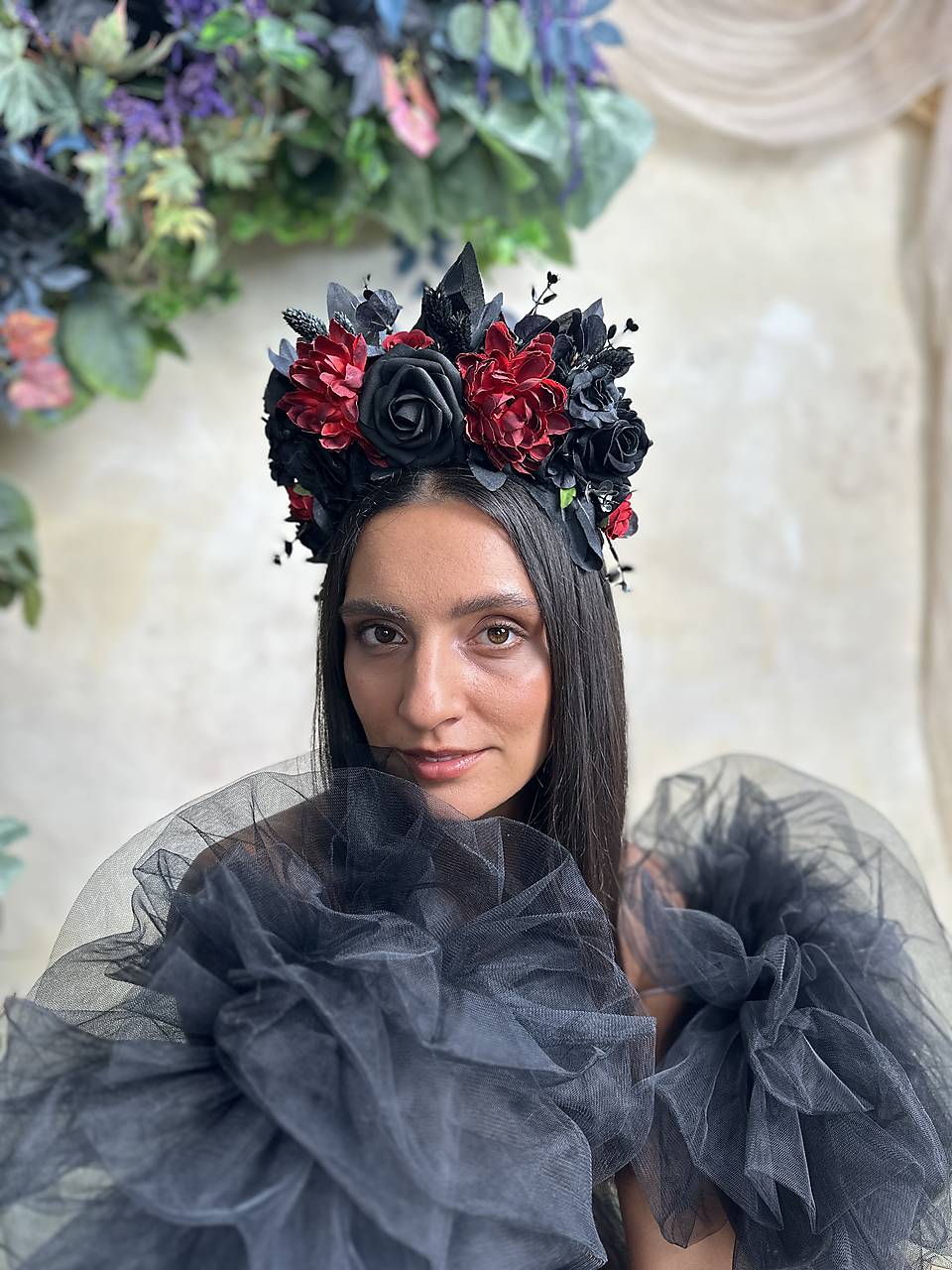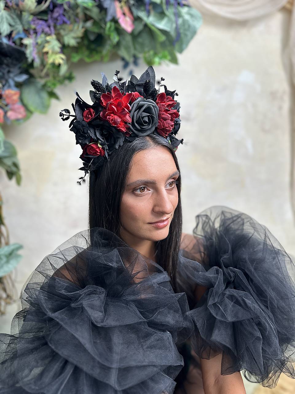 Veľká kvetinová čelenka v boho štýle v čierno-červených tónoch, inšpirovaná ikonickým účesom Fridy Kahlo. Vďaka zdobeniu pôsobiacemu dohora krásne vynikne na vypnutých účesoch či spletených vrkočoch – presne tak, ako ich nosila Frida.