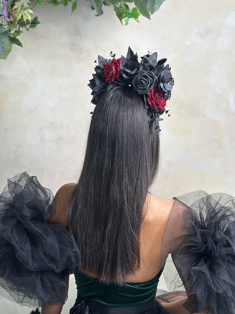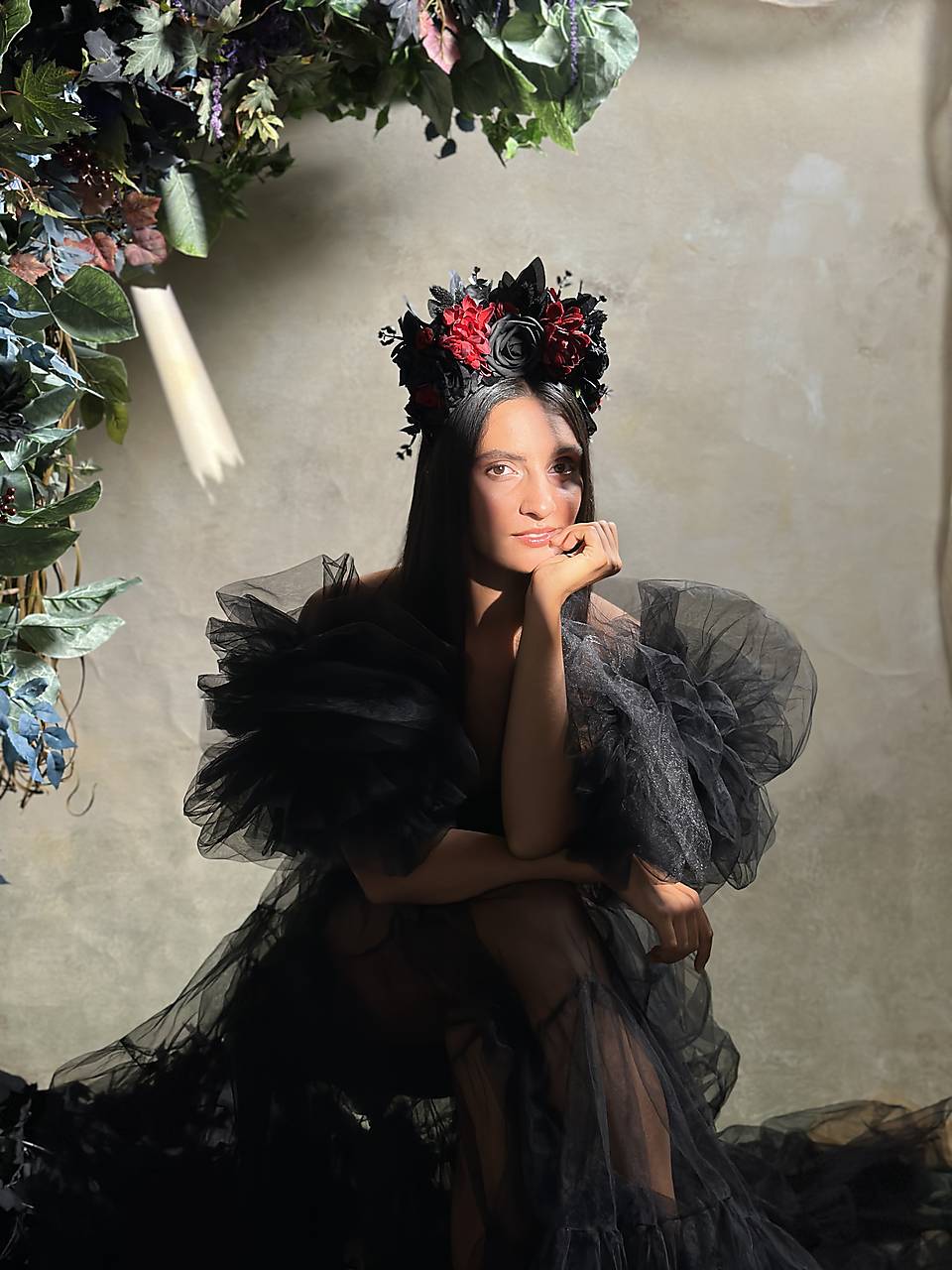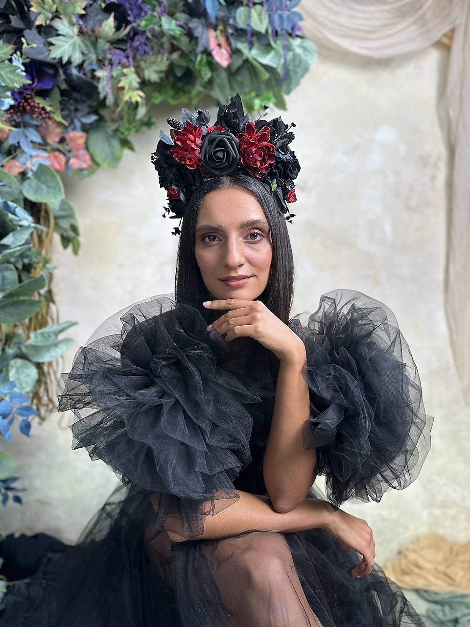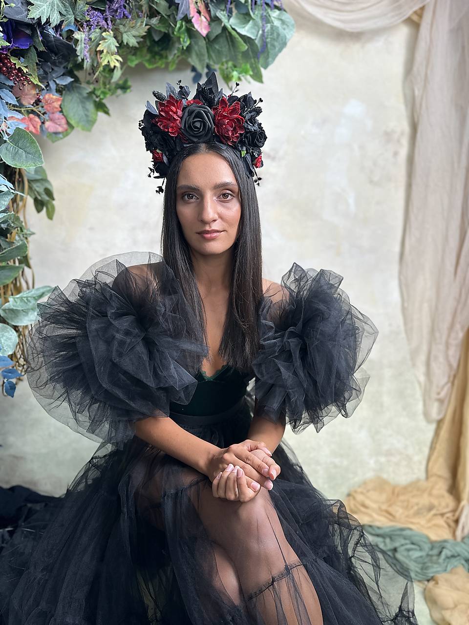 Veľká kvetinová čelenka v boho štýle v čierno-červených tónoch, inšpirovaná ikonickým účesom Fridy Kahlo. Vďaka zdobeniu pôsobiacemu dohora krásne vynikne na vypnutých účesoch či spletených vrkočoch – presne tak, ako ich nosila Frida.