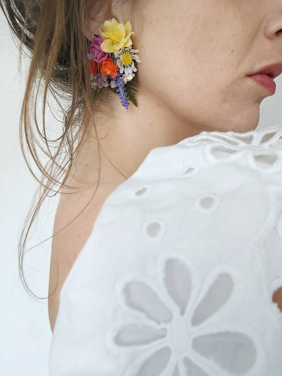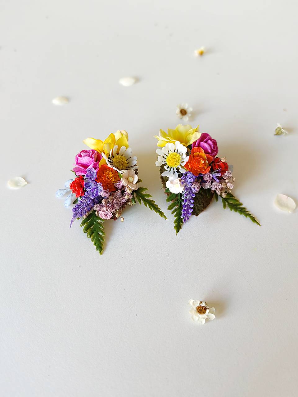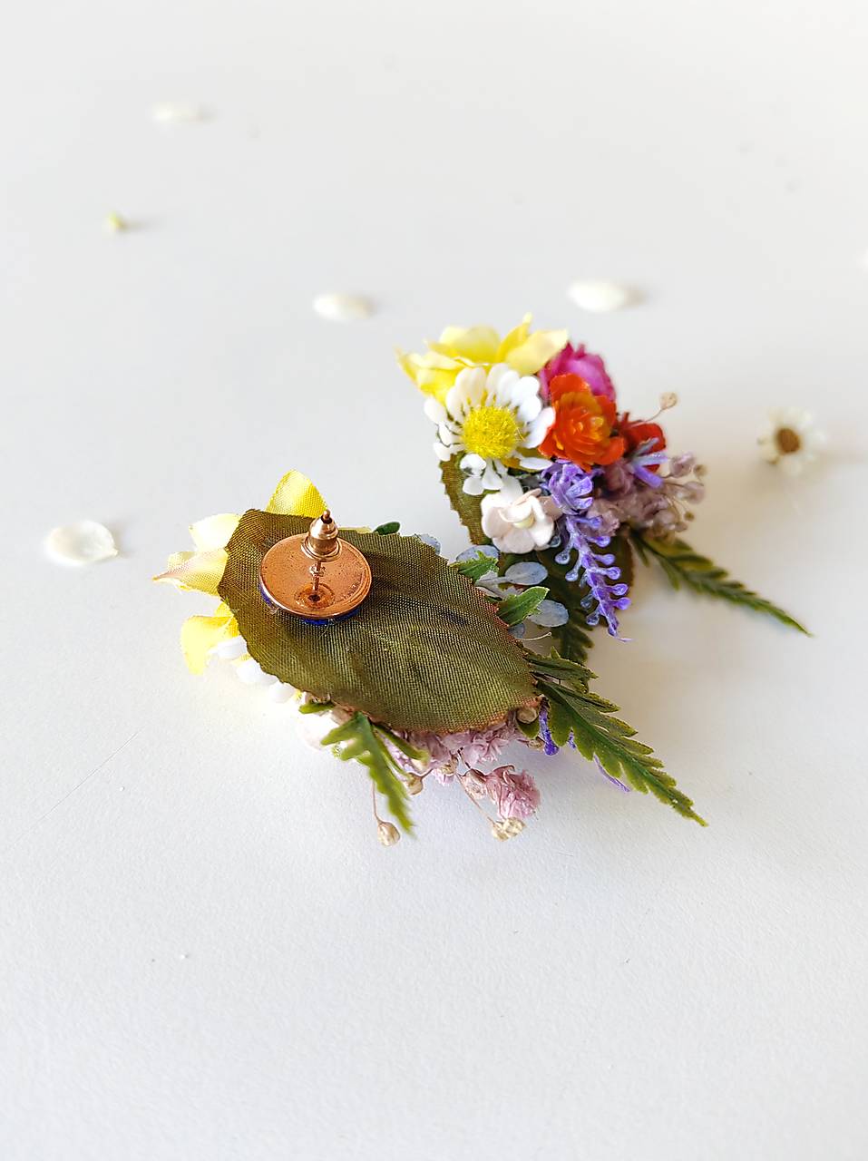 Náušnice sú vyrobené z aranžérskych kvetov a konzervovaných materiálov.