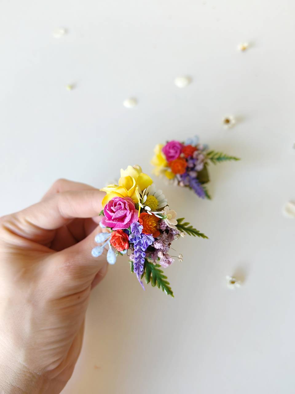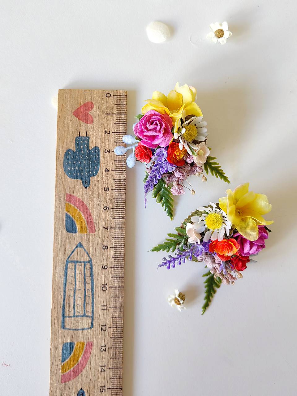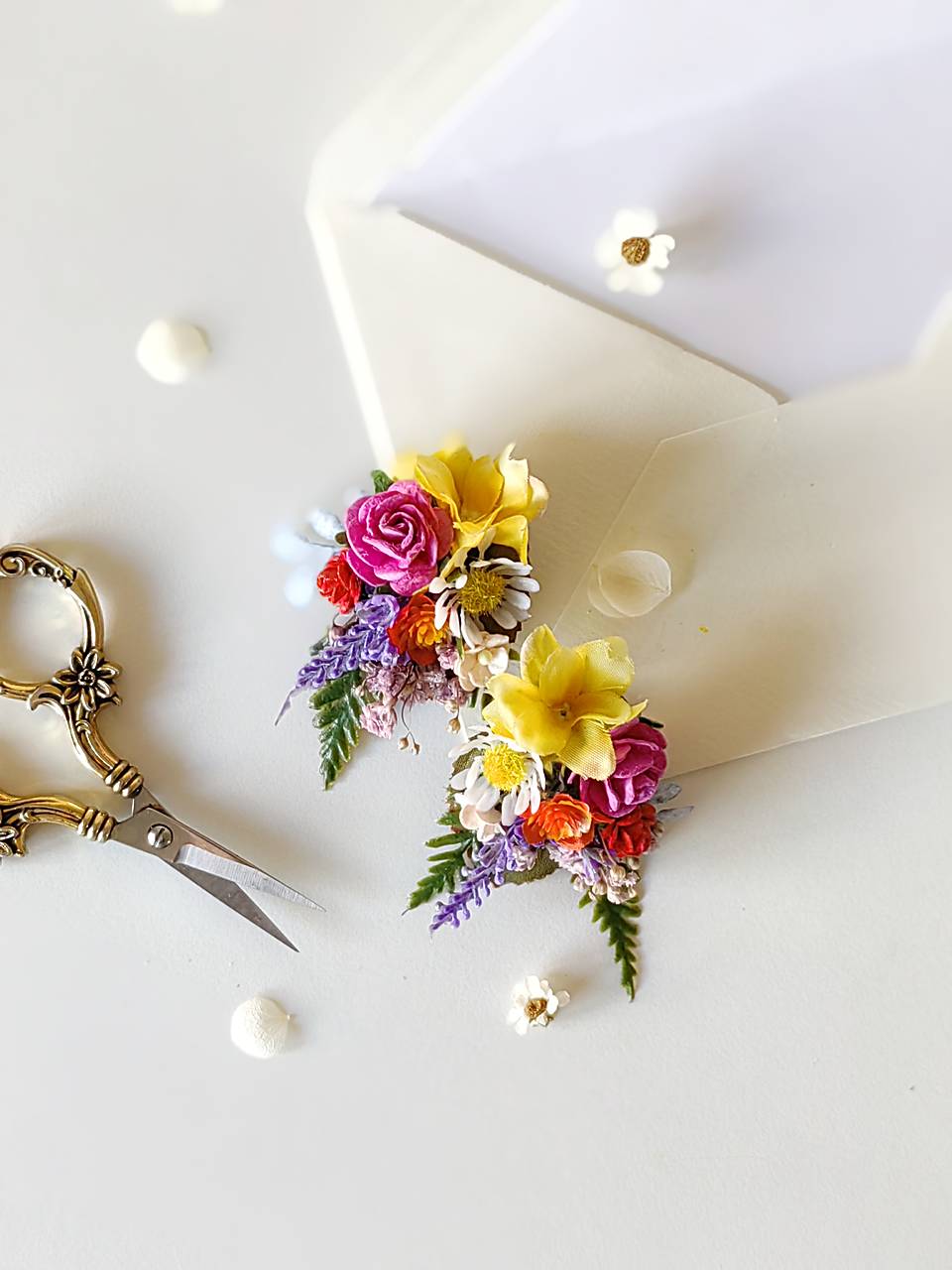 Náušnice sú vyrobené z aranžérskych kvetov a konzervovaných materiálov.