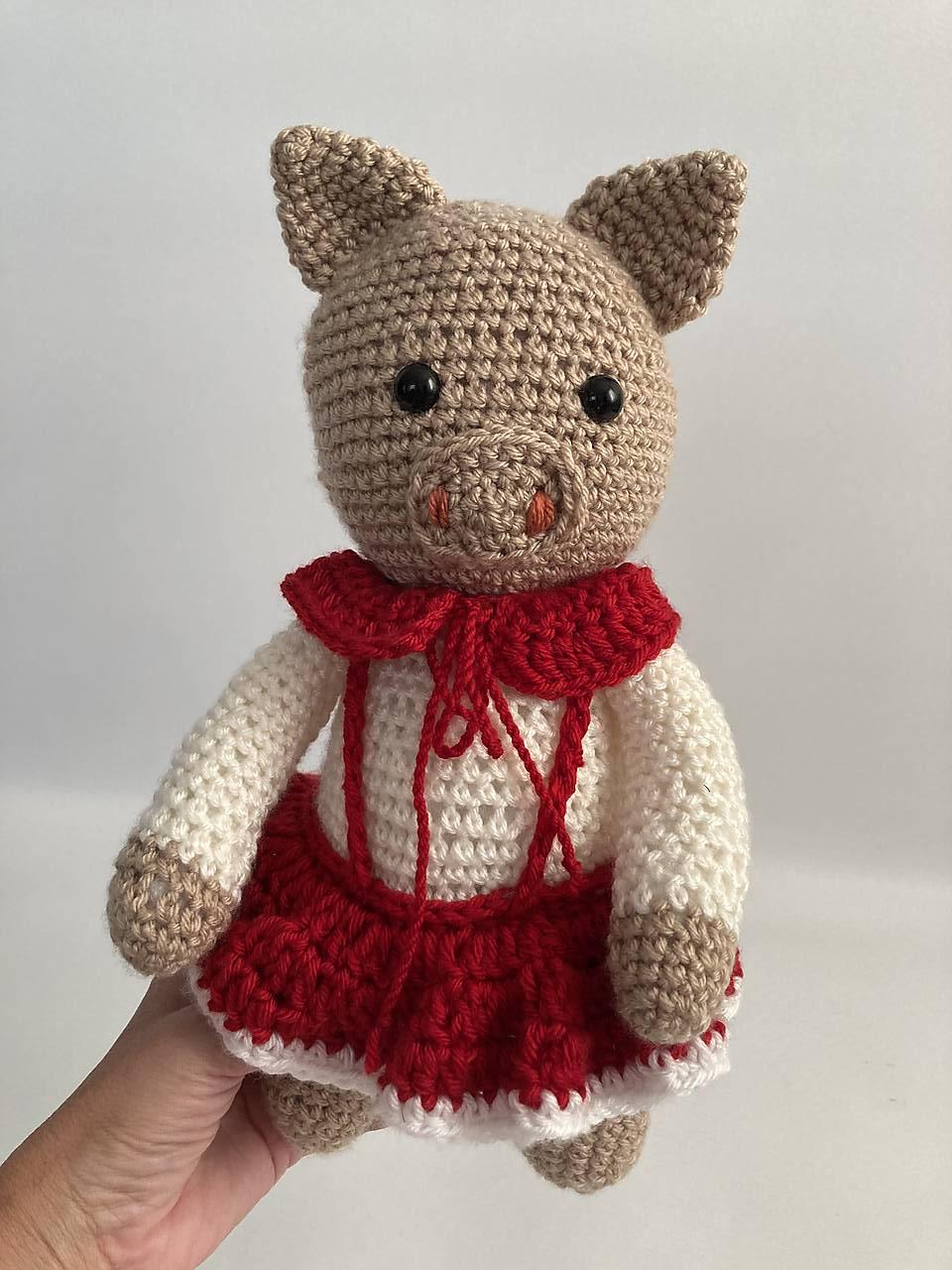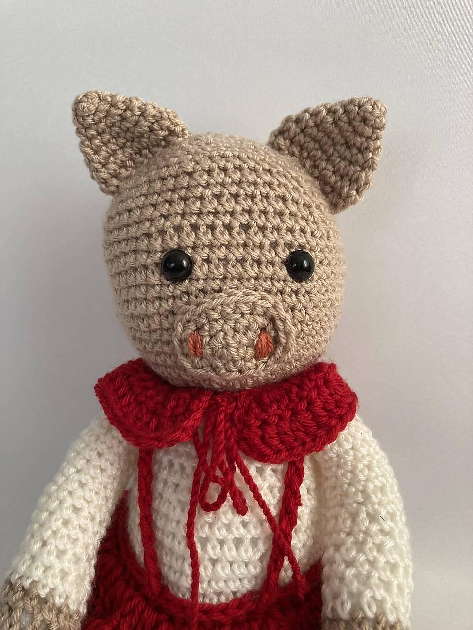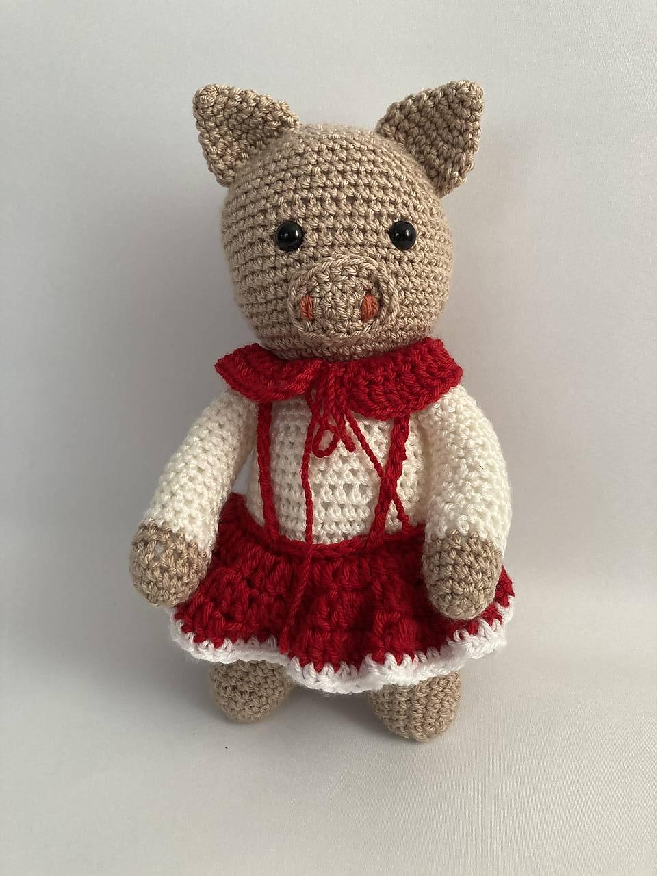 prasiatko v červenej sukničke a biely svetrík s červeným golierikom