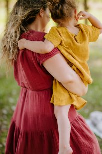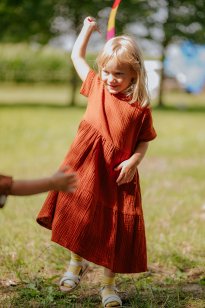 Na fotke: dámske šaty Štvorka z bambusového mušelínu a Krtkove gate z bavlneného mušelínu.