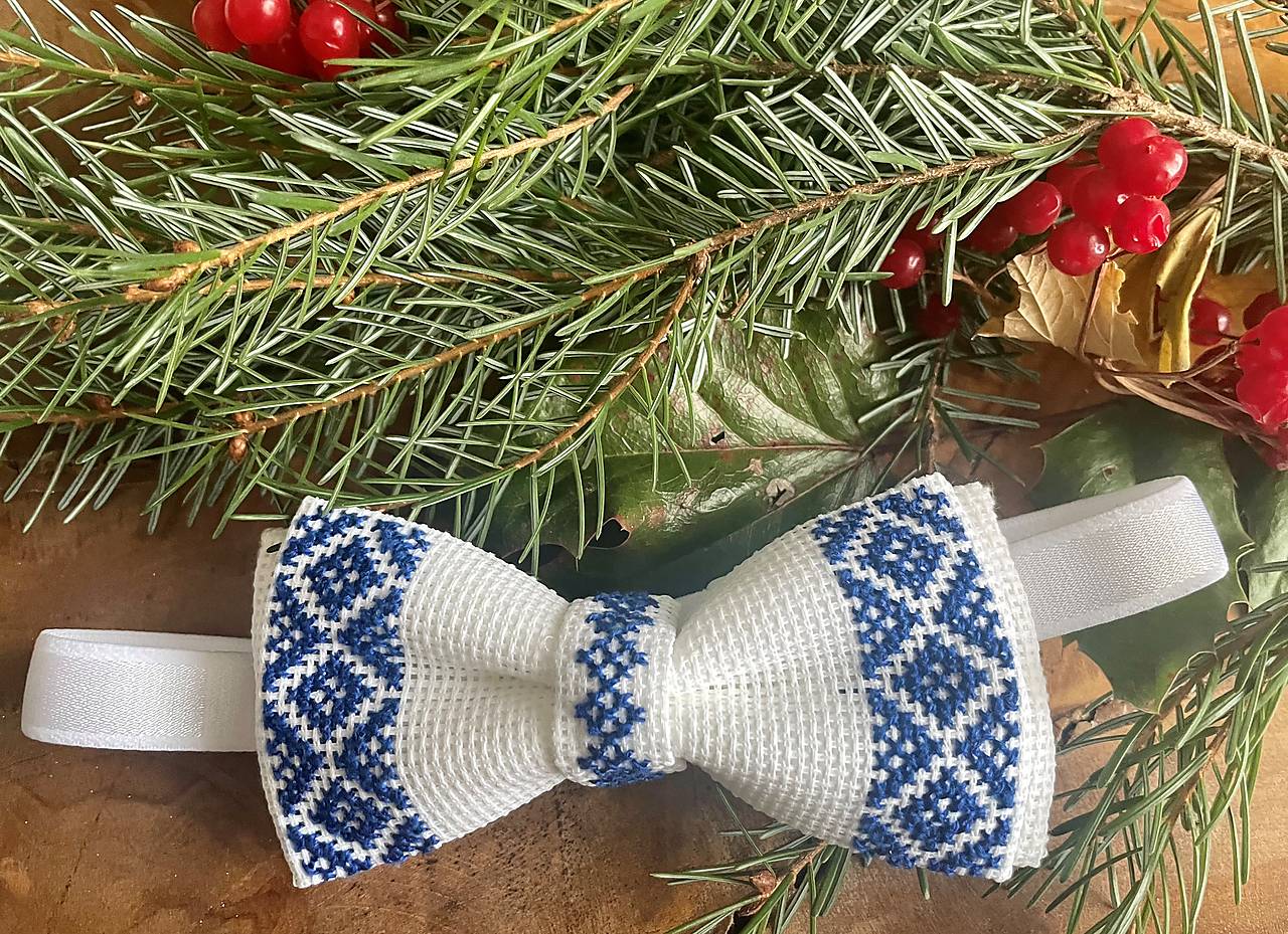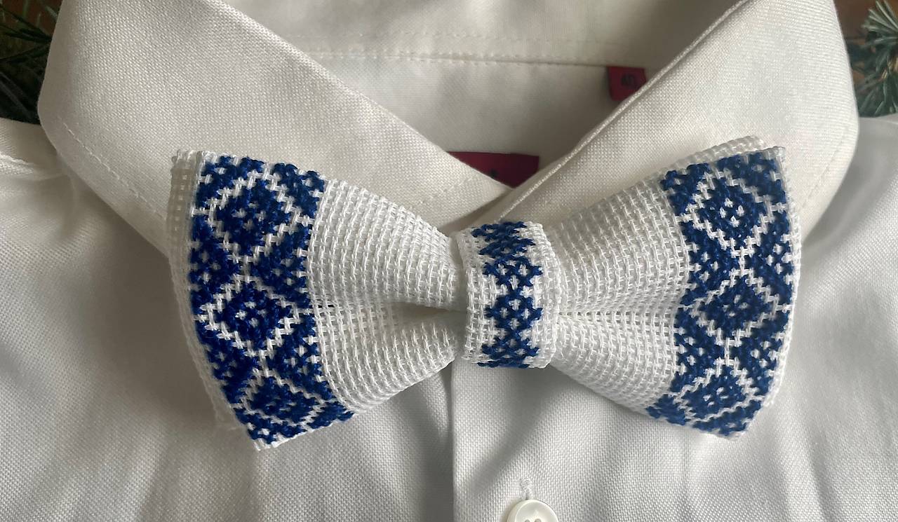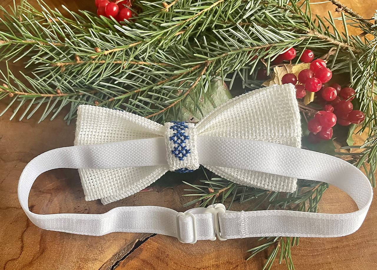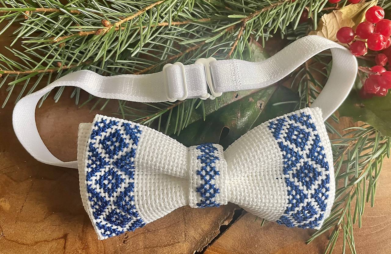 Motýlik je vyšívaný krížikovou technikou na bielu vyšívaciu látku. Modrou bavlnkou je vyšitý ľudový motív. Zapínanie okolo krku je nastaviteľné. Na objednávku je možné vyšiť motýlik aj v inej farbe.
