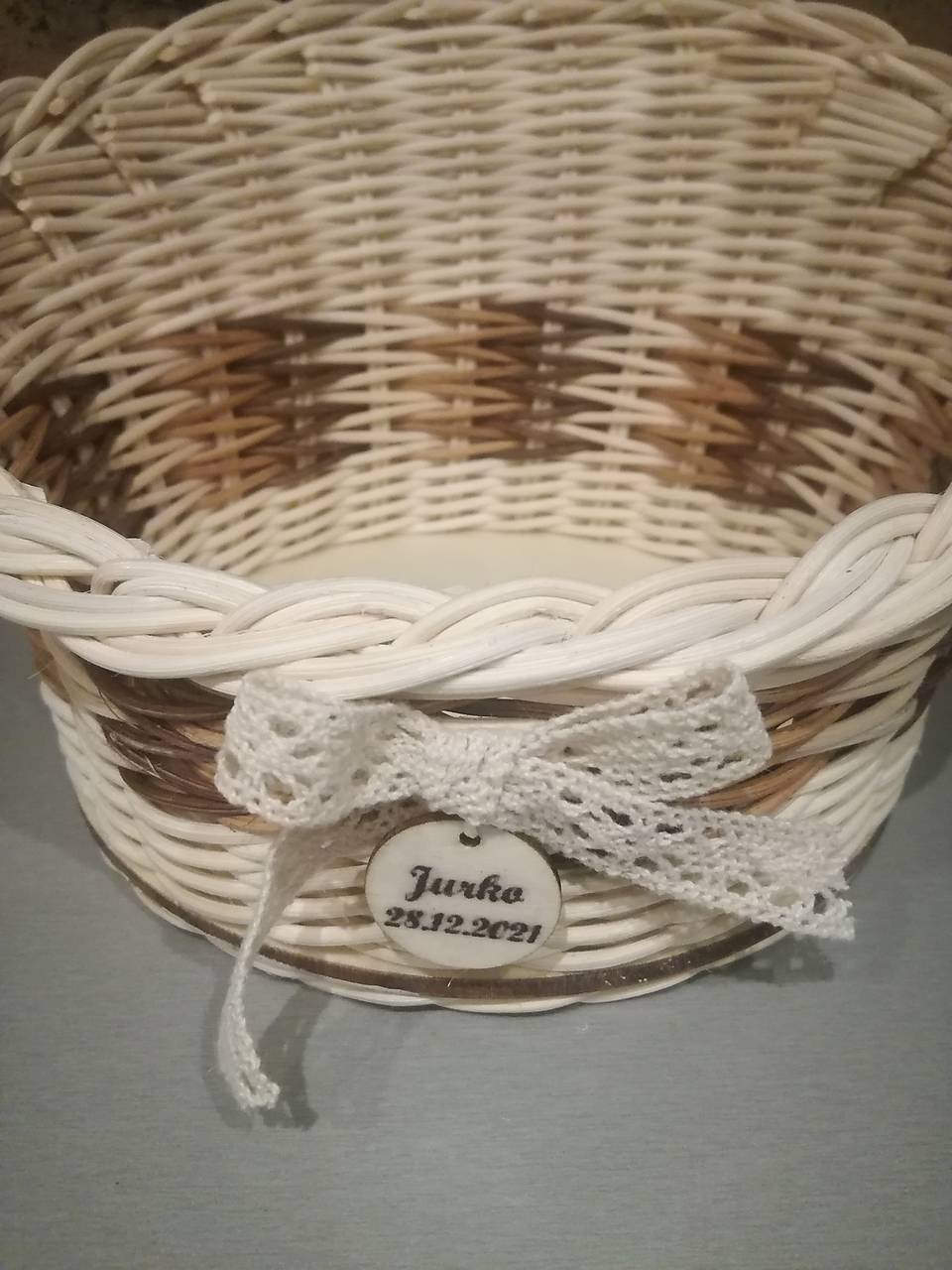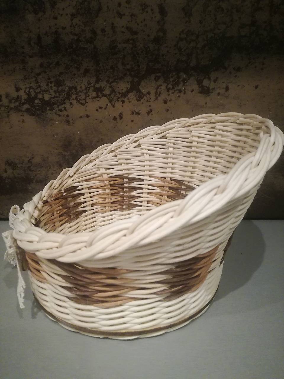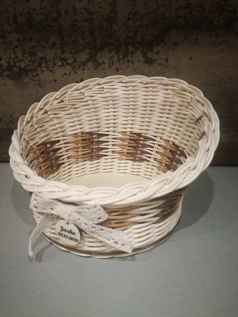 Košík skosený z pedigu, kombinácia prírodný a farebný hnedý, priemer 15 cm.