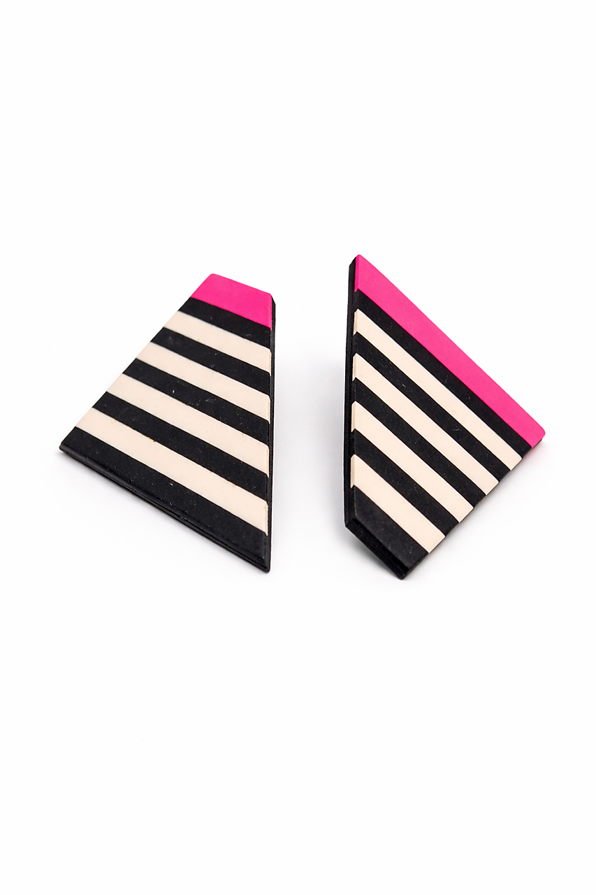 Moderný vzhľad čierno-bielych pruhov je doplnený neónovo ružovými detailmi, ktoré vytvárajú výrazný statement doplnok. Keďže sú vyrobené z polymérovej hmoty, sú ľahké, odolné voči vode a nemenia farbu. Sú ideálne na každodenné nosenie.