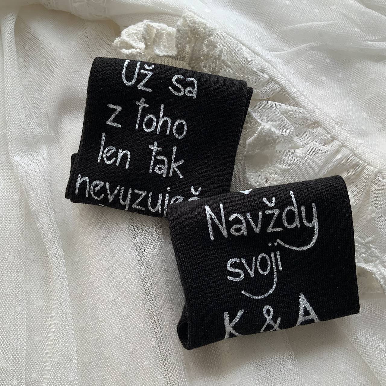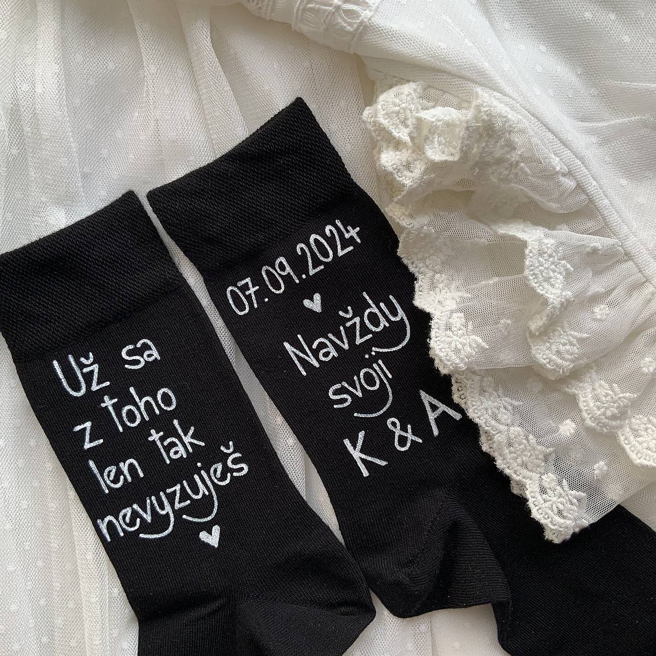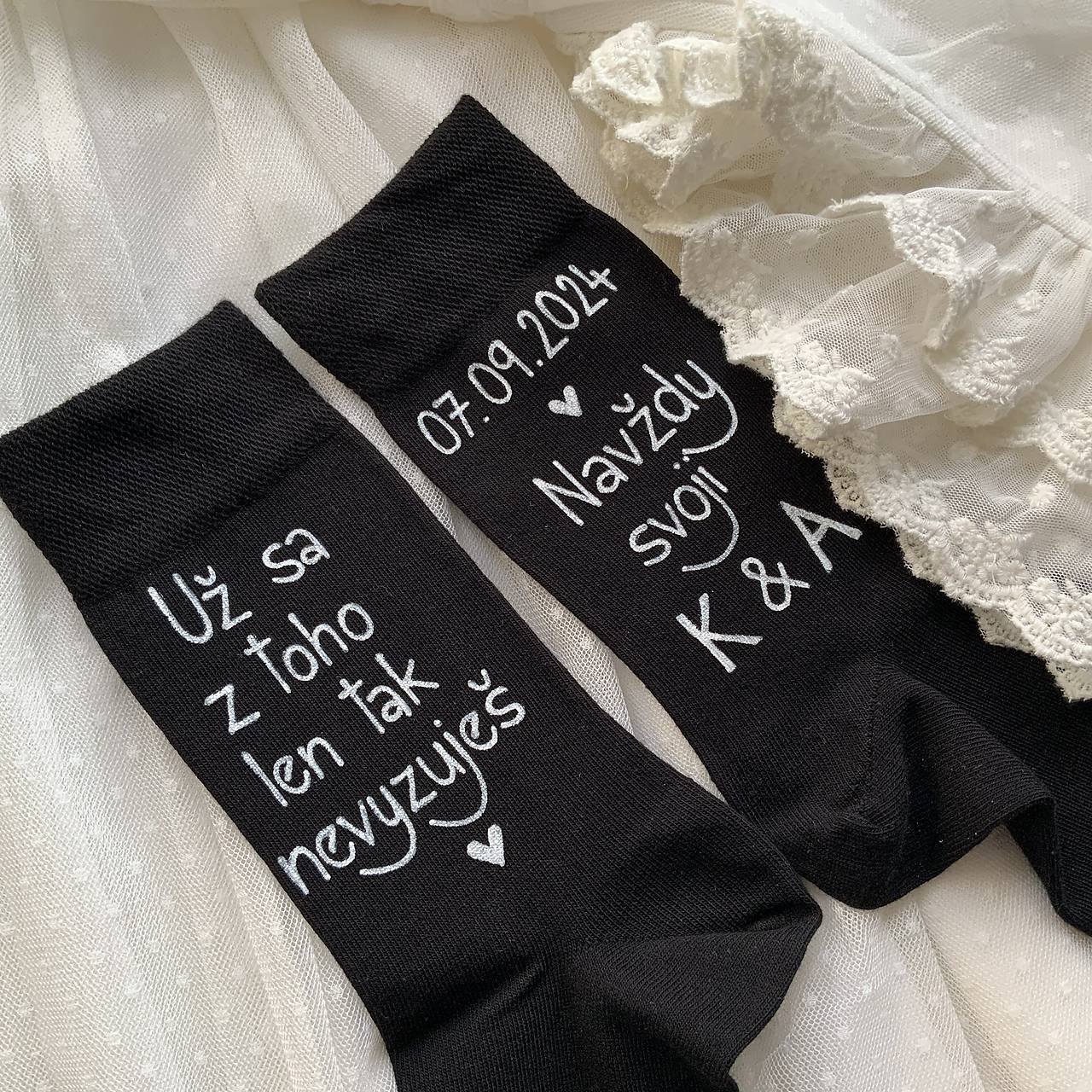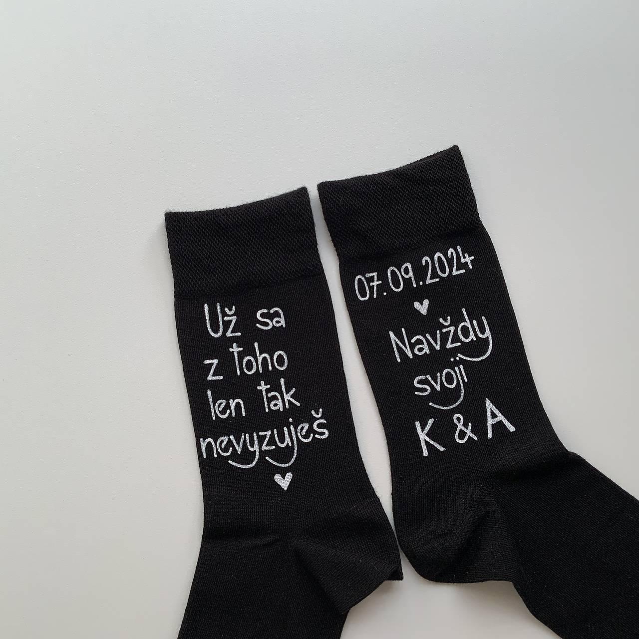 Originálne maľované ponožky s nápisom nad členkami z vonkajšej strany nôh: "Už sa z toho len tak nevyzuješ / dátum svadby Navždy svoji + iniciály…”
