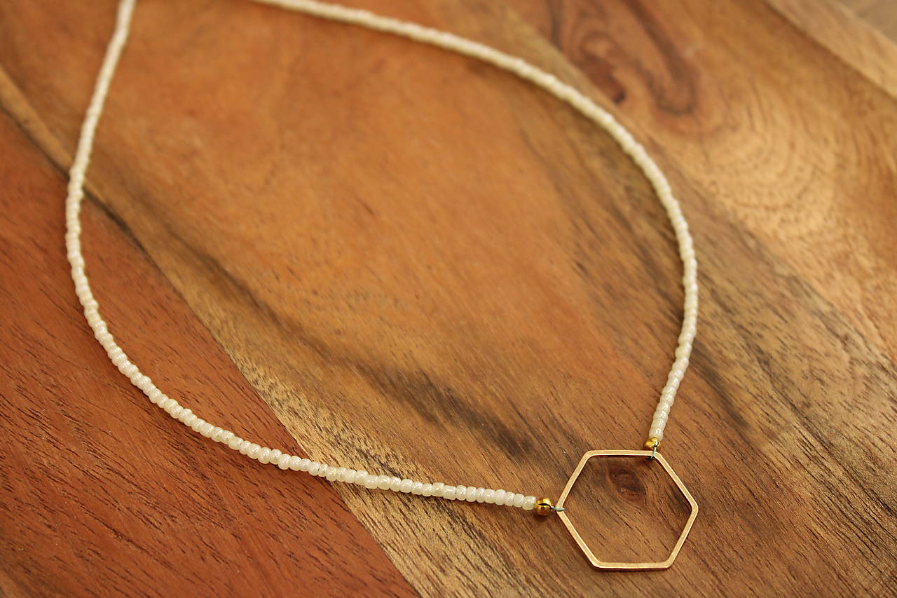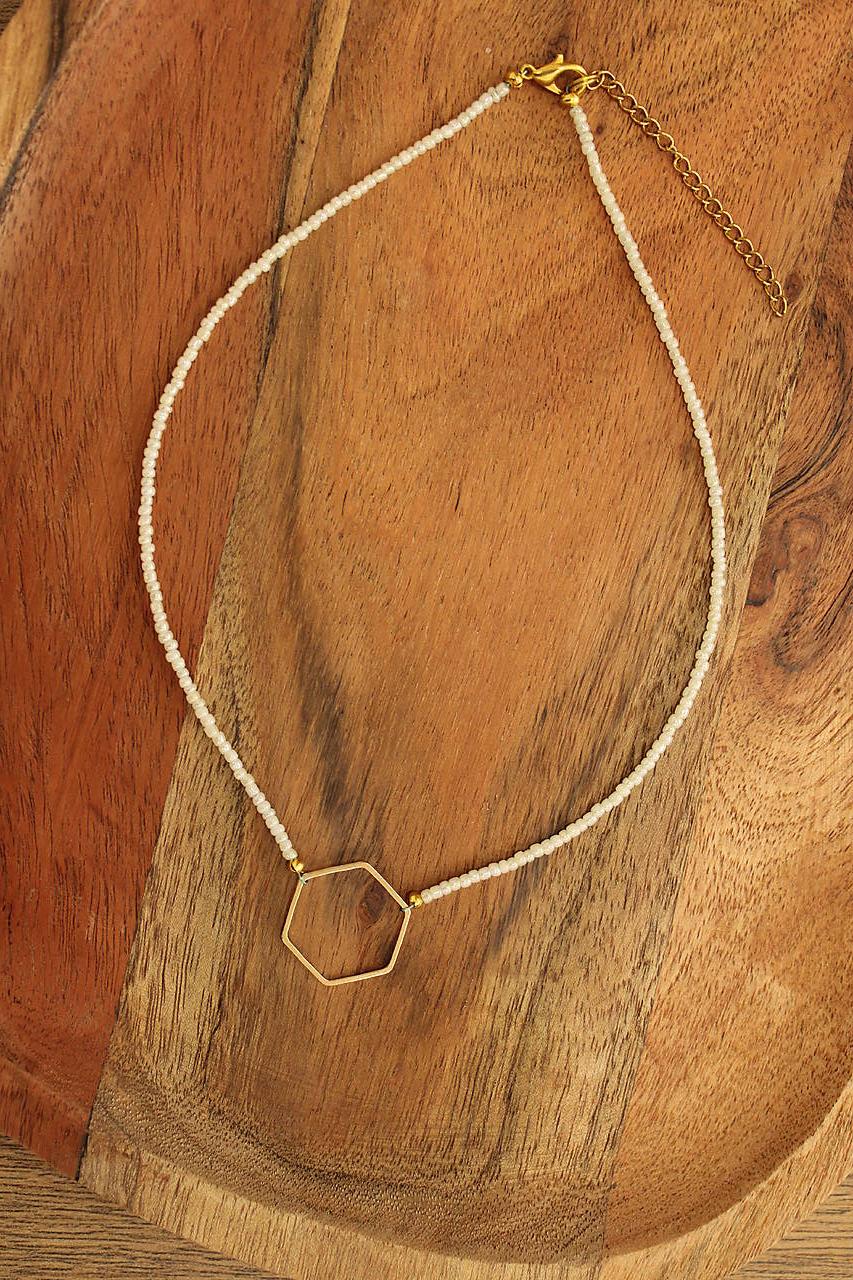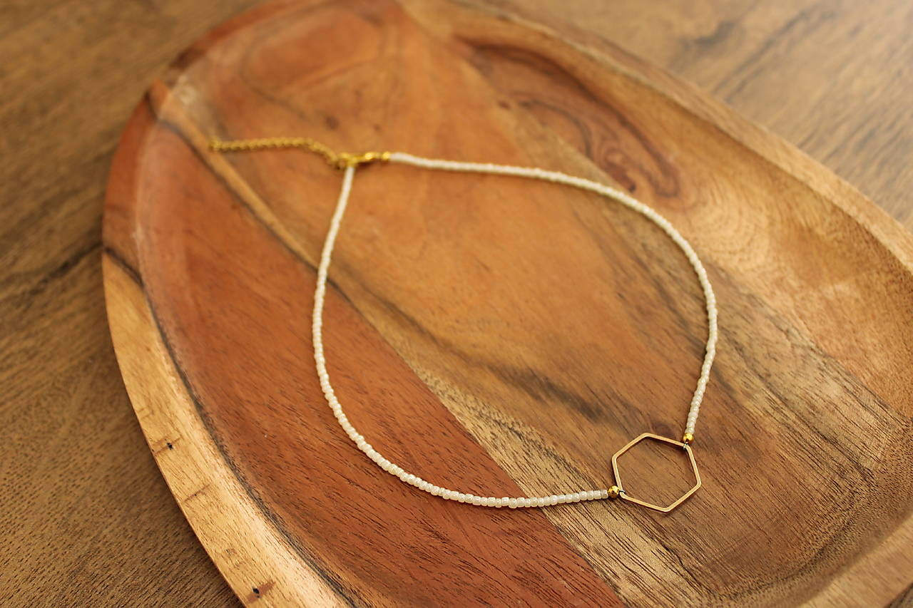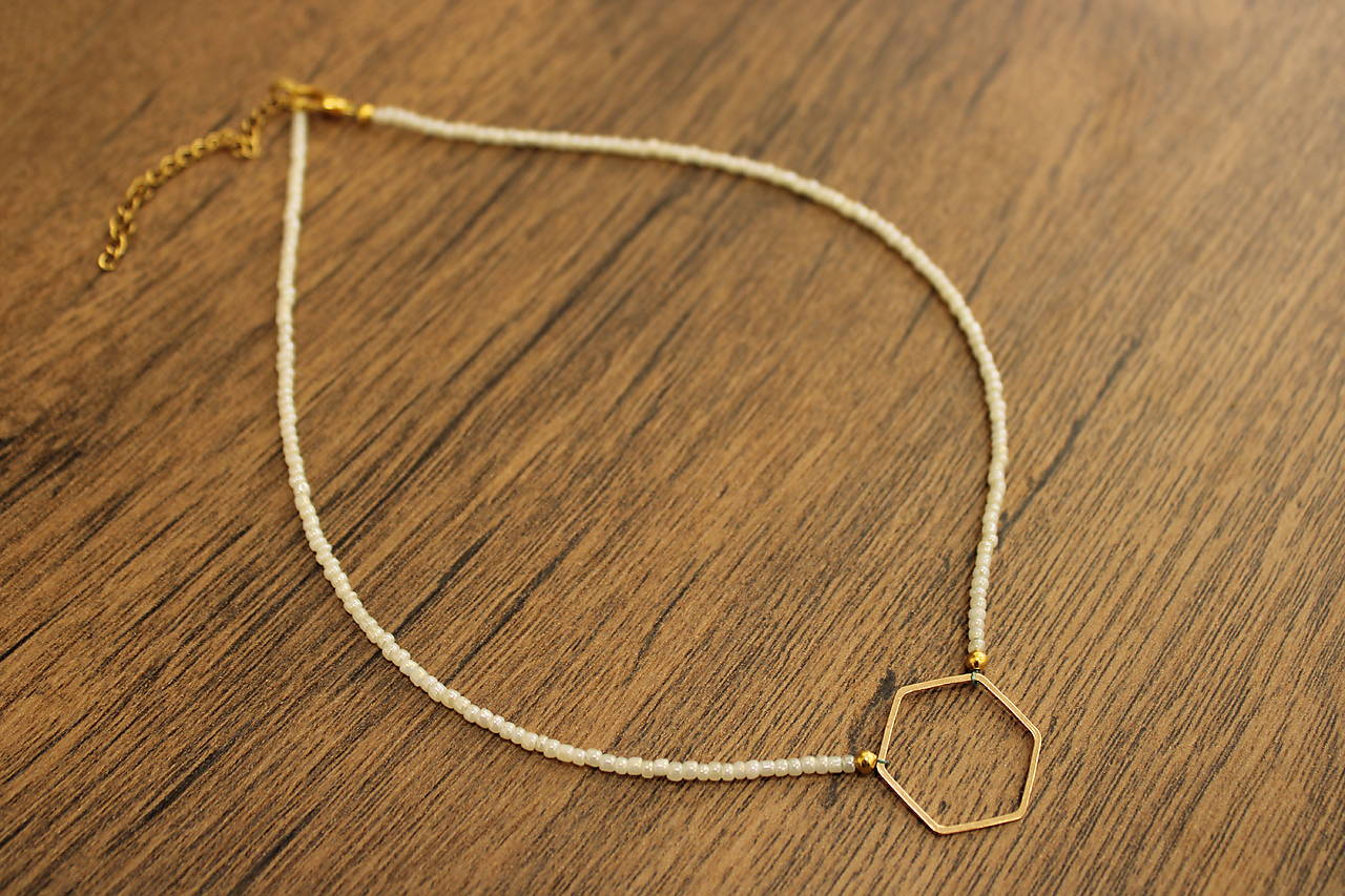 Minimalistický náhrdelník z lesklých rokajlových korálok bielej perleťovej farby doplnený šesťuholníkom v zlatej farbe.