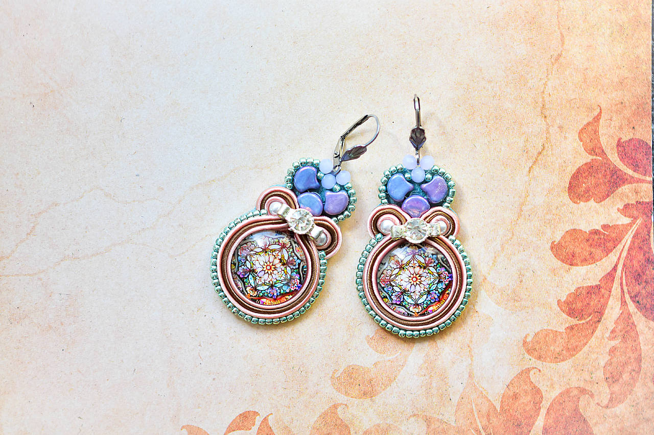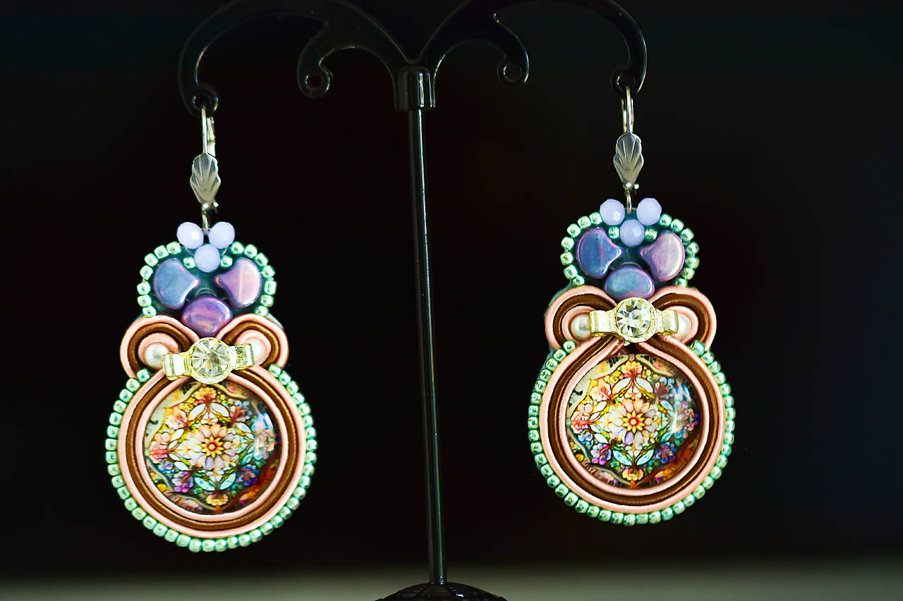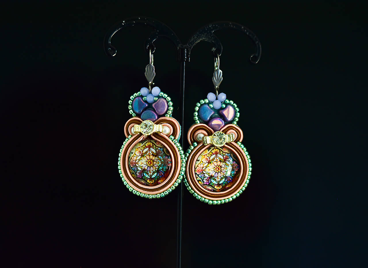 Kvetinové čarovné soutache náušnice s motívom kvetov ručne šité zo šujtášu. Použitá je soutache technika náročná na čas a precíznosť. Na výrobu náušníc som použila kryštály, šujtáš, korálky Rokajl a Toho a kovové komponenty. Farba šperku je hnedá a trocha zelenej. Soutache bižutéria je ľahká a príjemná na ušiach. Originálny darček pre manželku, dcéru alebo mamu na vianoce, narodeniny, ples, stužkovú alebo svadbu.