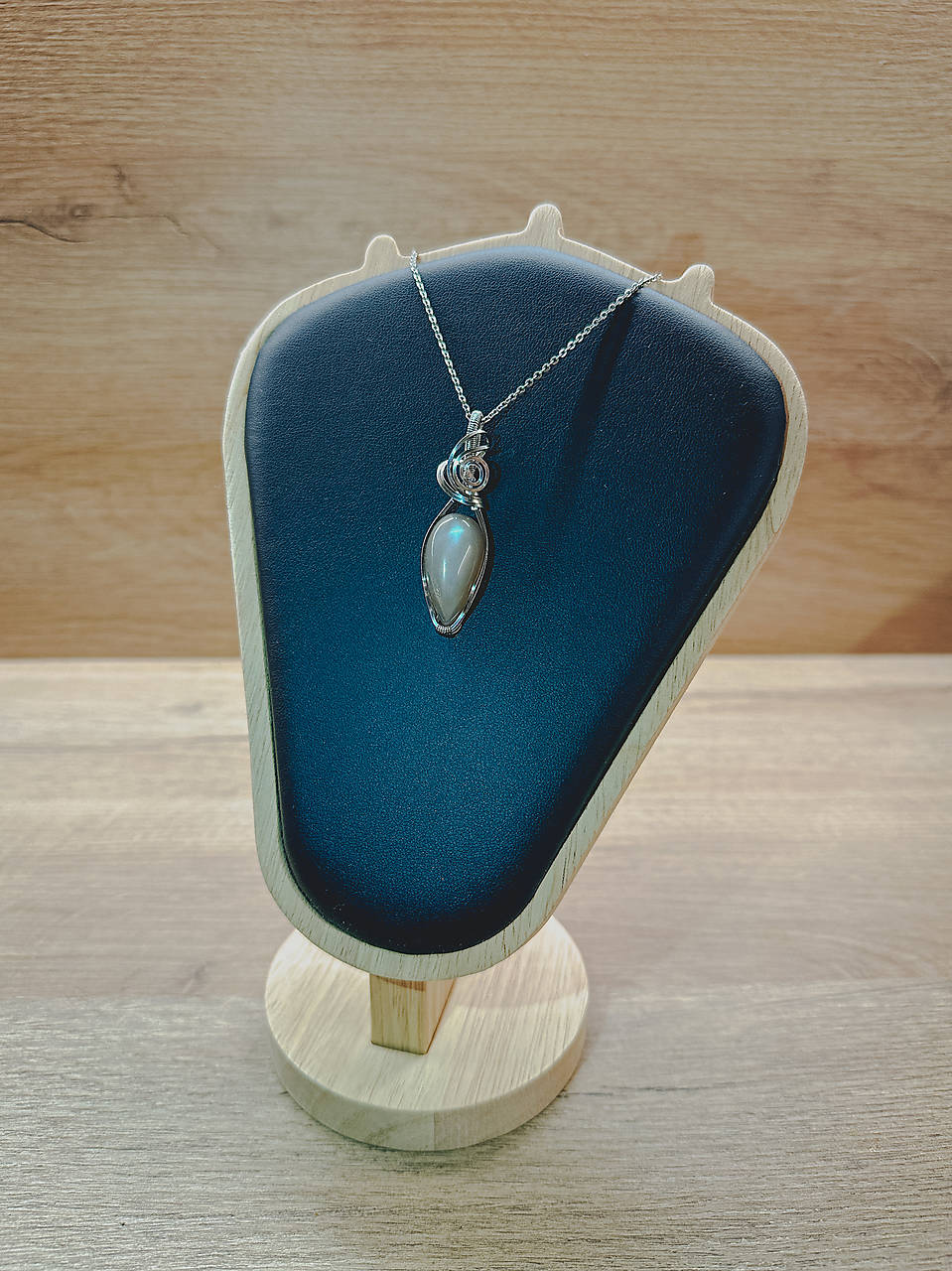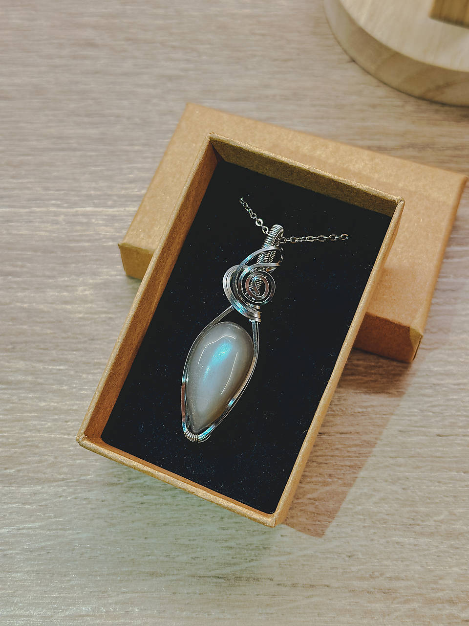 Ručne vyrobený prívesok z chirurgickej ocele so šedým mesačným kameňom.