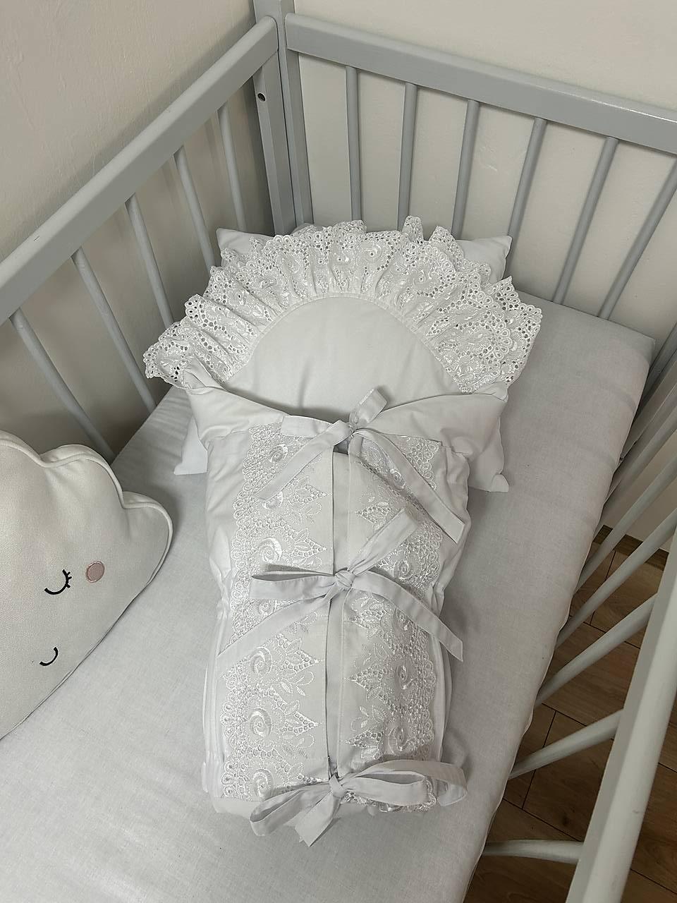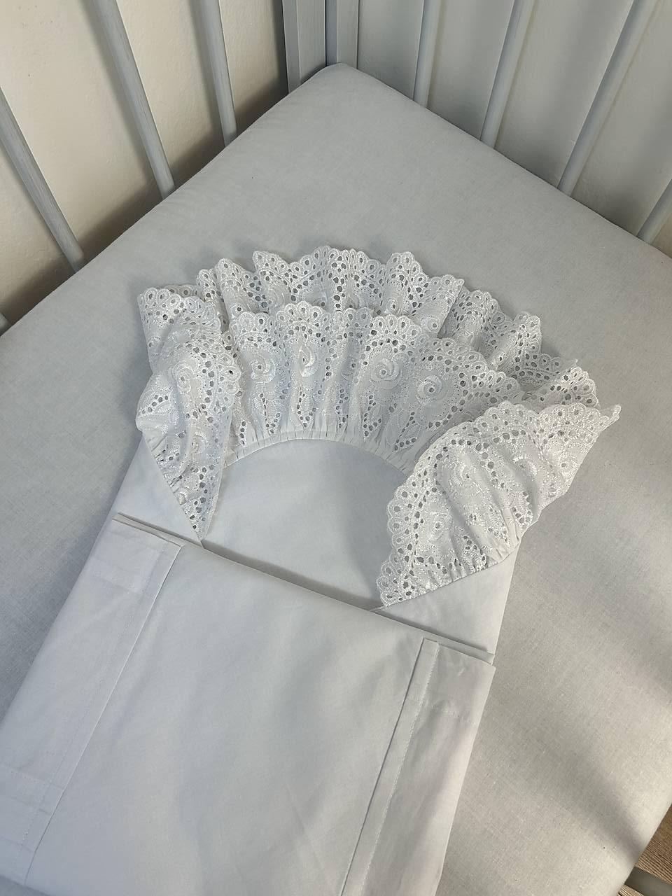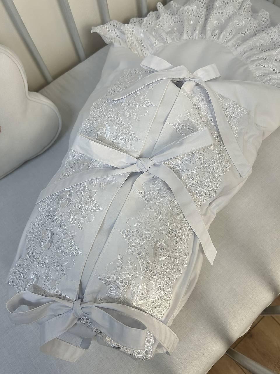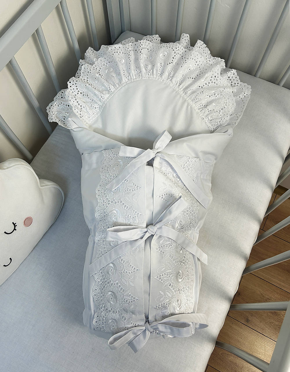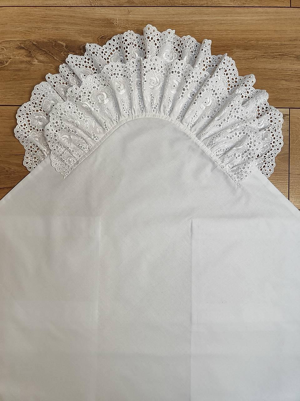 Biela klasická šnurovacia zavinovačka vhodná na krst, ozdobená krásnou snehobielou bohato vyšívanou 10,5 cm madeirou.