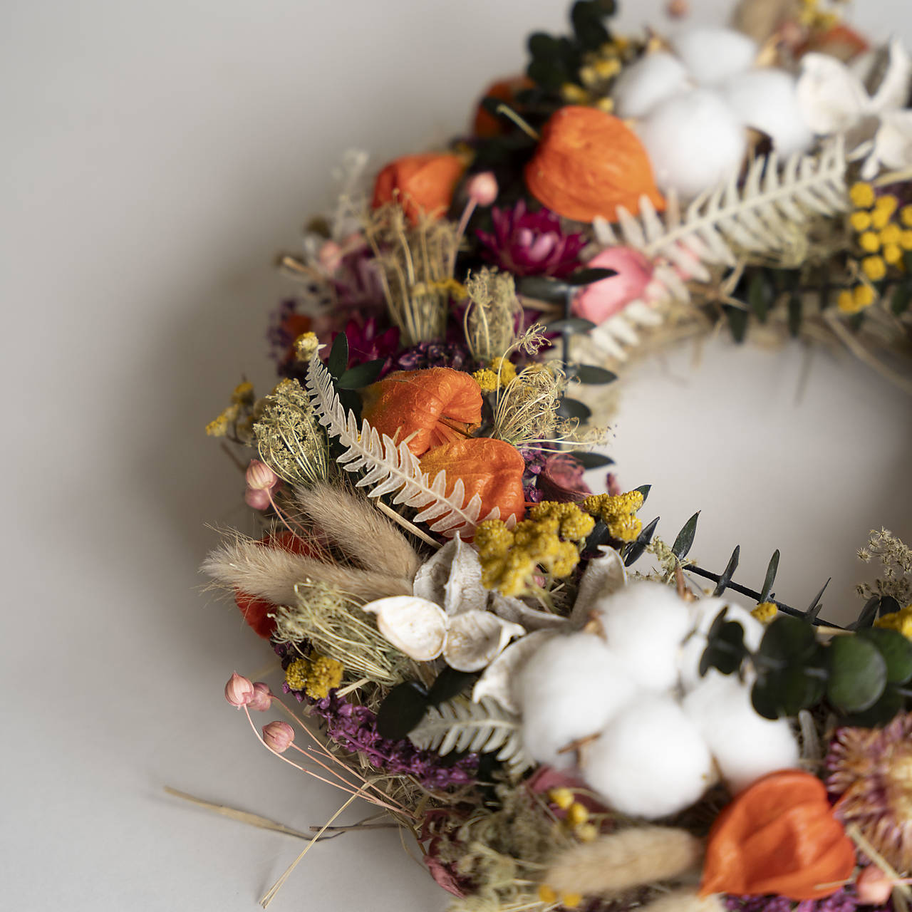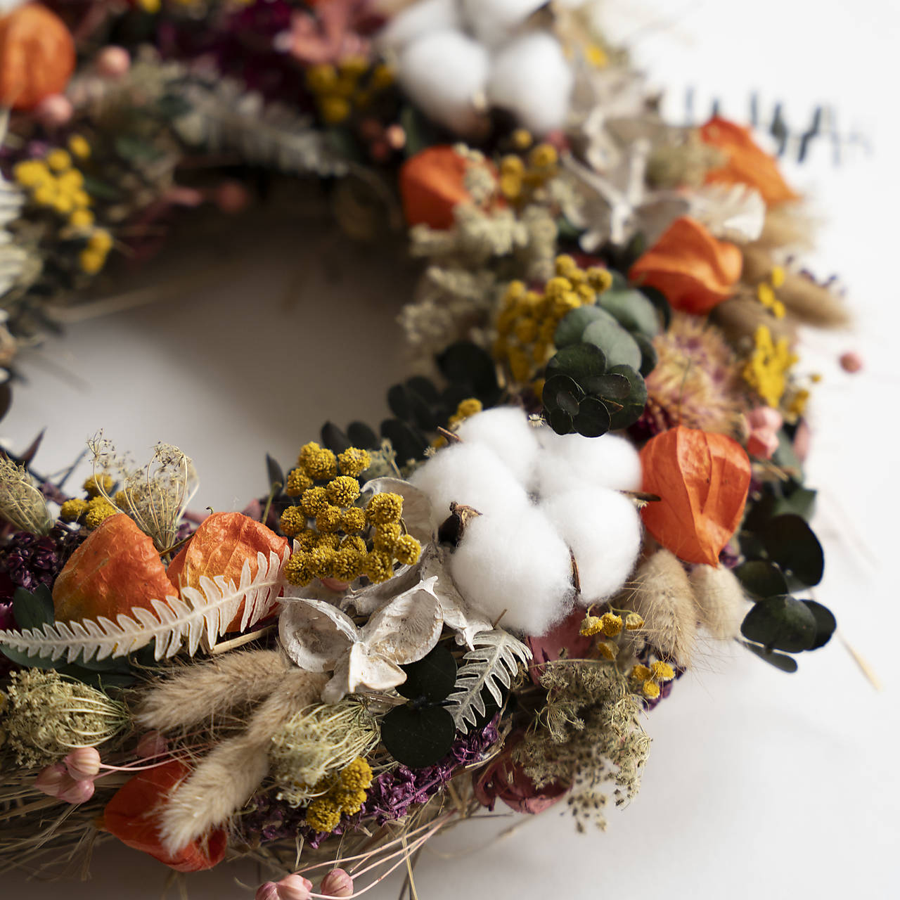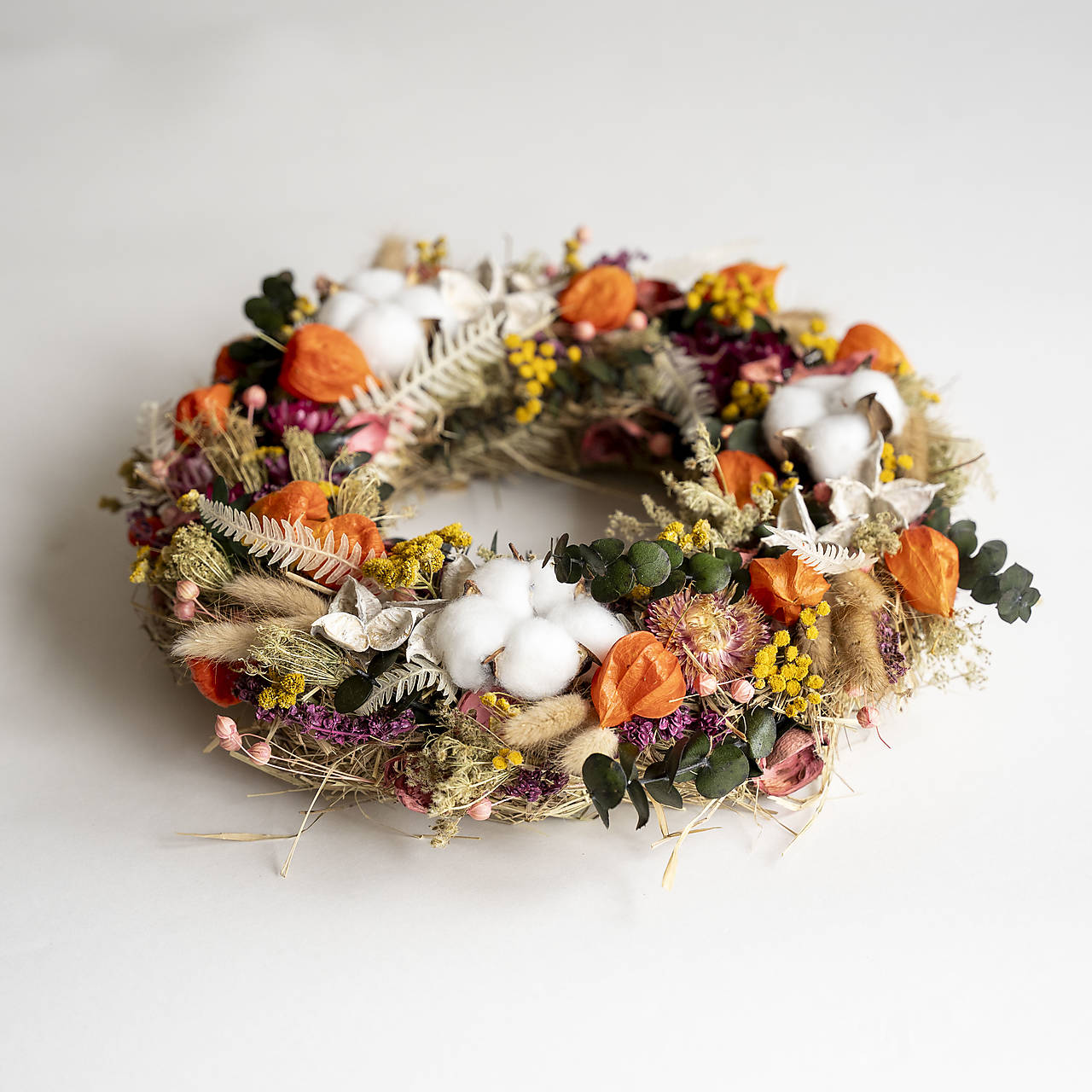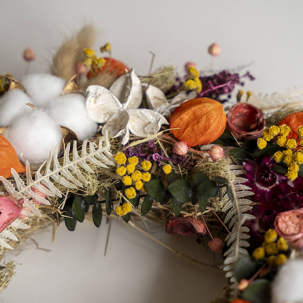 Vo venčeku nájdete aj voňavý konzervovaný eukalyptus, biebené časti papradia, sušený lagurus, ľan a iné sušené farbené či prírodné časti rastlín a plodov.