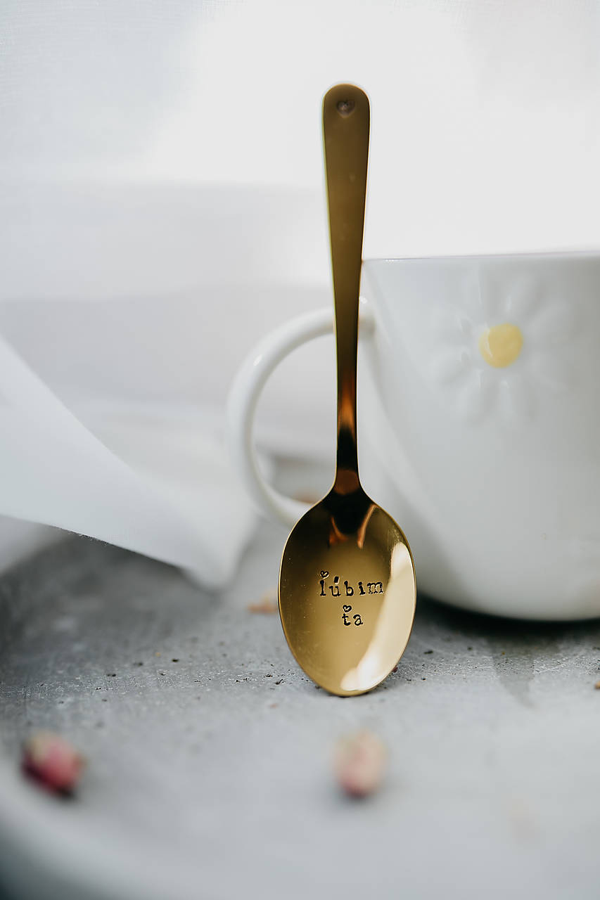 Lyžička vyrobená z ocele s ručne vyrazeným textom v dolnej naberacej časti lyžičky "ľúbim ťa". Na rúčke lyžičky je ručne vyrazený symbol srdiečka. namiesto mäkčeňov sú na lyžičke ručne vyrazené malé srdiečka. Jedna sa o čajovú lyžičku s dĺžkou 14cm.